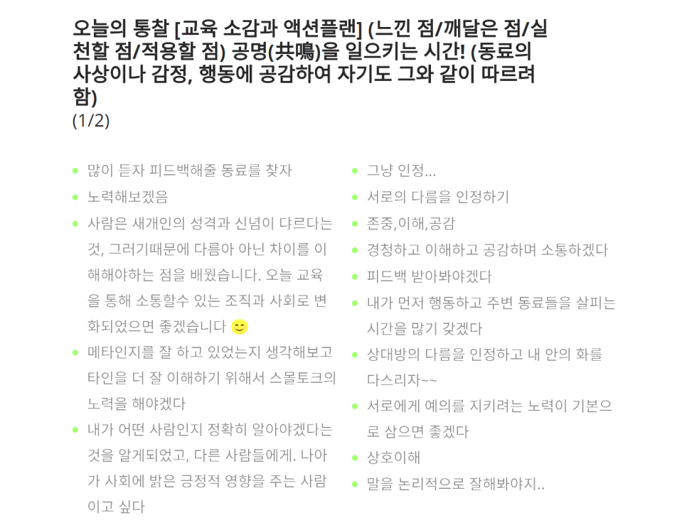 두 번째는 공감의 정의와 실천 방법입니다. 공감 대화 5단계 프로세스를 통해 상대방을 진정으로 이해하고, 사람을 살리는 공감의 힘에 대해 깊이 있게 논의했습니다.