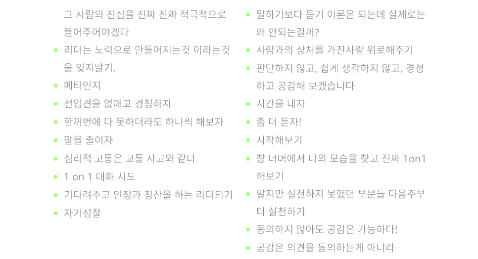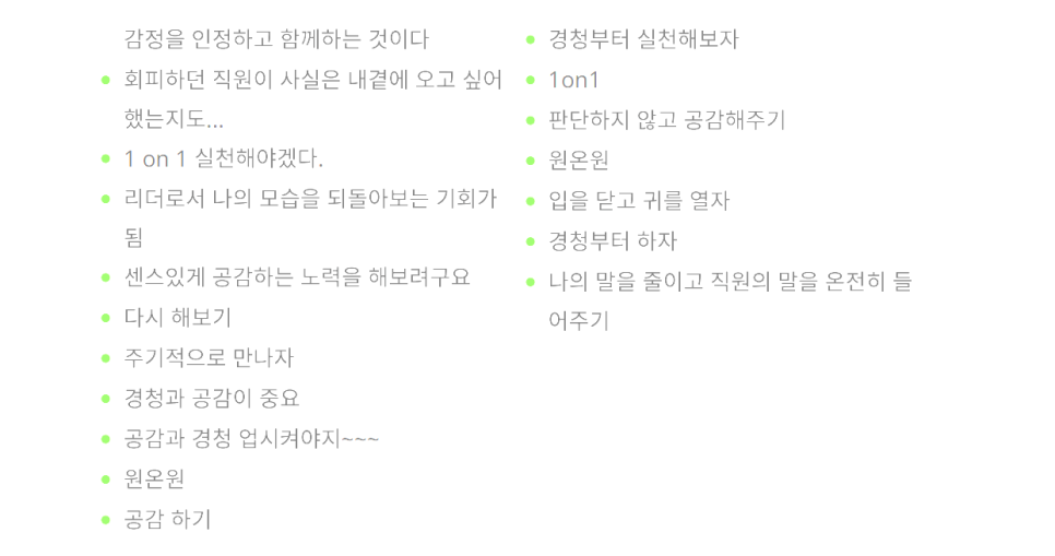 교육 마지막에 다룬 원온원(1 ON 1) 면담에 대한 내용도 많은 분들에게 새로운 관점을 제시해드릴 수 있었습니다. 단순히 업무 점검이 아닌, 구성원의 성장과 발전을 위한 소통의 장으로서의 원온원 면담의 중요성을 강조했습니다.