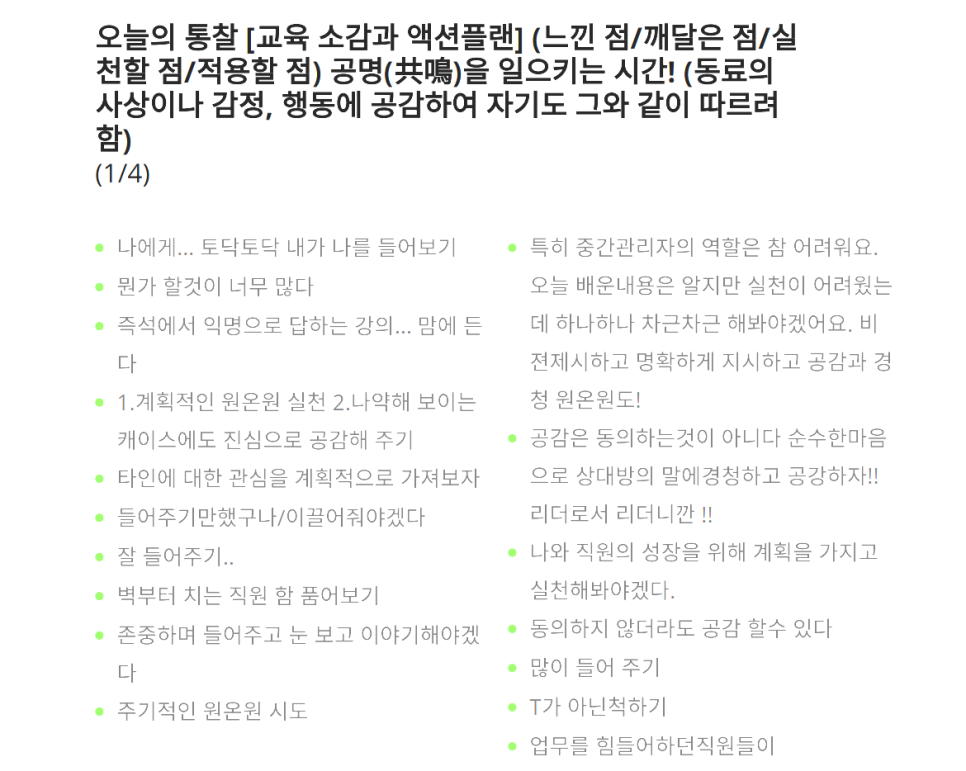 변화하는 의료환경 속에서 리더의 역할은 그 어느 때보다 중요해지고 있습니다. 특히 간호리더들은 환자의 생명과 직결된 업무를 수행하는 팀을 이끌어야 하는 막중한 책임을 지고 있습니다. 이런 상황에서 오늘 교육에 참여해주신 모든 분들의 배움에 대한 열의가 정말 인상적이었습니다.