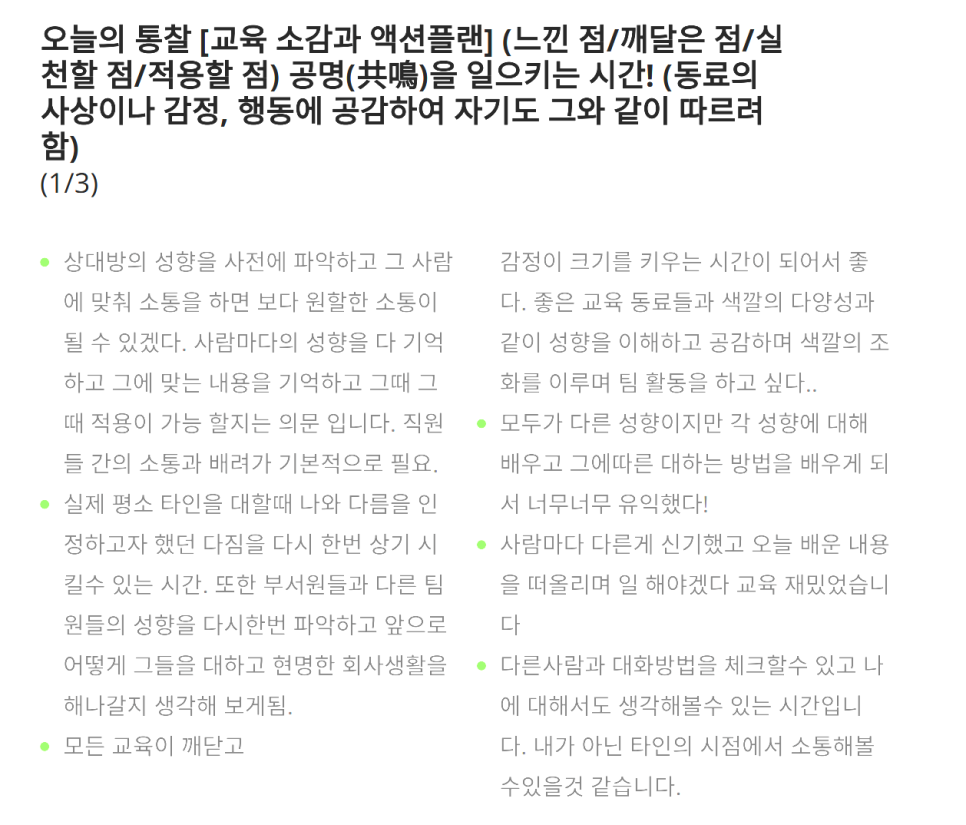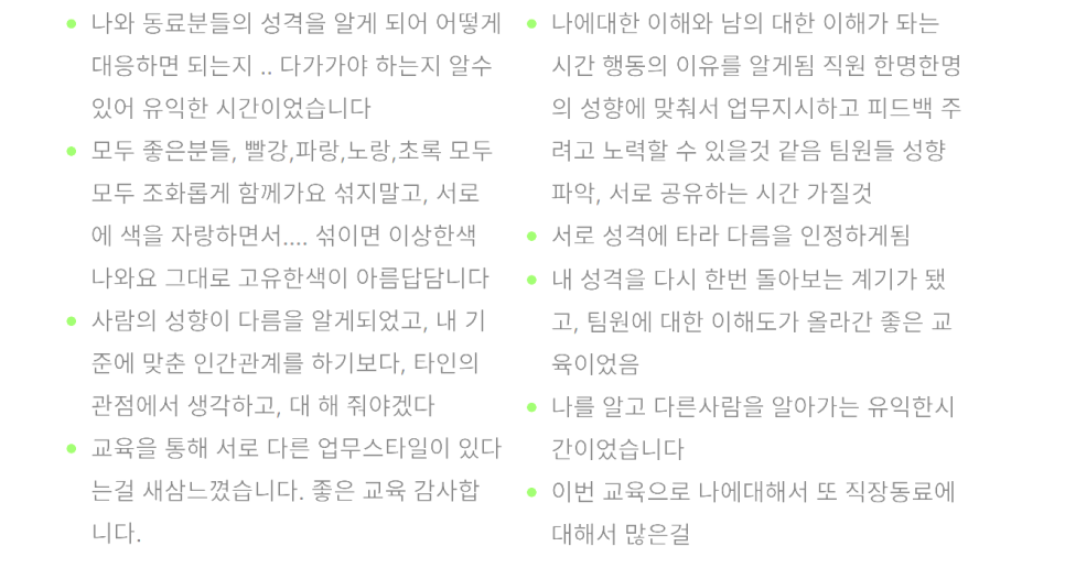 교육이 끝난 후, 많은 분들이 자신의 리더십 스타일을 점검하고 동료들을 바라보는 시선이 바뀌었다고 말씀해주셨습니다. 이번 교육을 통해 얻은 가장 큰 성과는 바로 '다름의 이해'일 것입니다. 사람의 성격은 타고나는 것인지, 환경에 의해 변화하는 것인지에 대한 철학적 질문부터 시작하여, 서로의 차이를 인정하고 존중하는 자세가 조직의 성장에 얼마나 중요한지 깨닫는 시간이었습니다.