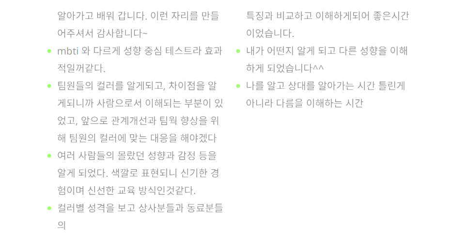 "시간 가는 줄 모르고 특강에 몰입했다", "강의와 실습이 적절히 조화를 이뤄 지루할 틈이 없었다"는 교육생분들의 진심 어린 평가를 들으며, 강사로서 정말 큰 보람을 느꼈습니다. '역할 연기(Role Play)'를 통해 서로 다른 컬러 유형의 관계를 직접 경험하고, 효과적인 팀워크를 위한 '액션플랜'을 작성하는 과정은 교육의 내용을 단순한 지식 습득에서 나아가 실제 업무에 적용 가능한 실용적인 도구로 만들었습니다.