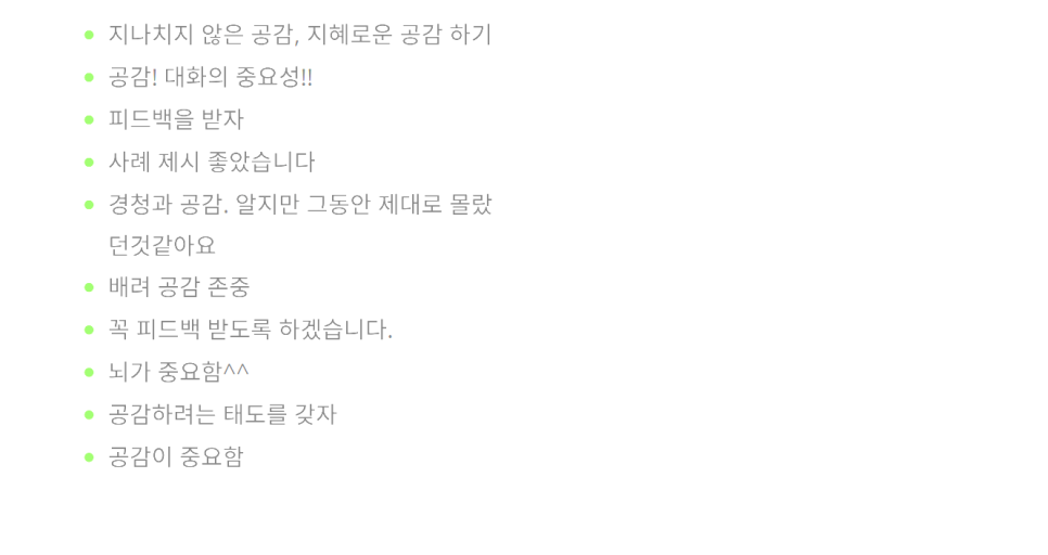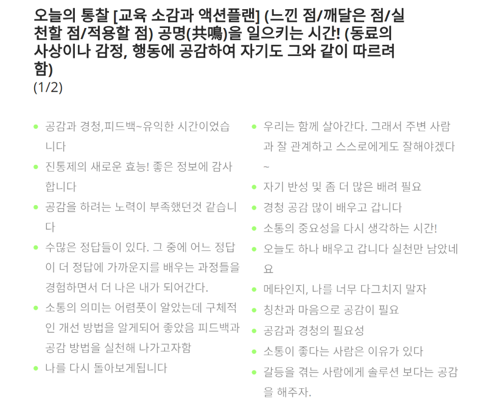 강의가 끝난 후, 교육 담당자분께 "엄청난 몰입도를 유지하면서 중요한 것만 쏙쏙 이야기해 주셔서 교육생들에게 너무나 도움이 된 시간이었다"라는 진심 어린 피드백을 받았습니다. "소통을 제대로 할 수 있는 팁을 얻고, 리더와 구성원이 함께 성과를 내는 인사이트를 얻었다"는 말씀은 저에게 큰 보람으로 남았습니다. "특강이지만 중간중간 토의식으로 서로의 생각을 공유하는 실습이 효과를 배가시켰다"는 교육생분들의 평가 역시 앞으로의 강의에 더 큰 영감을 주었습니다.