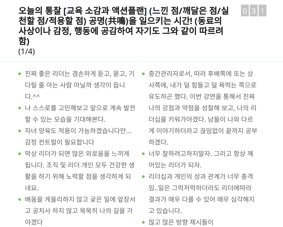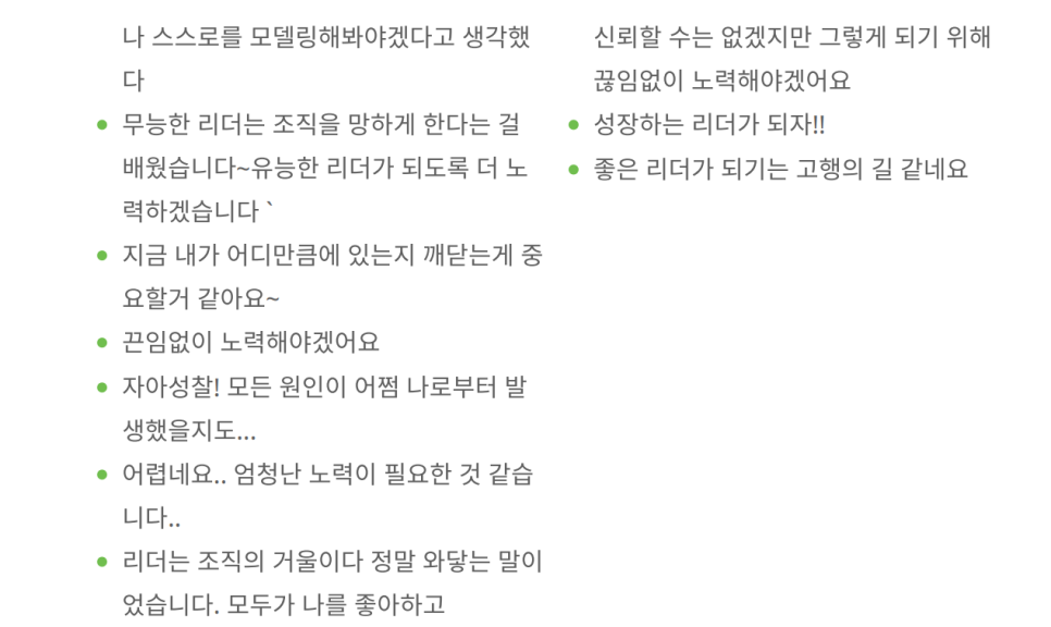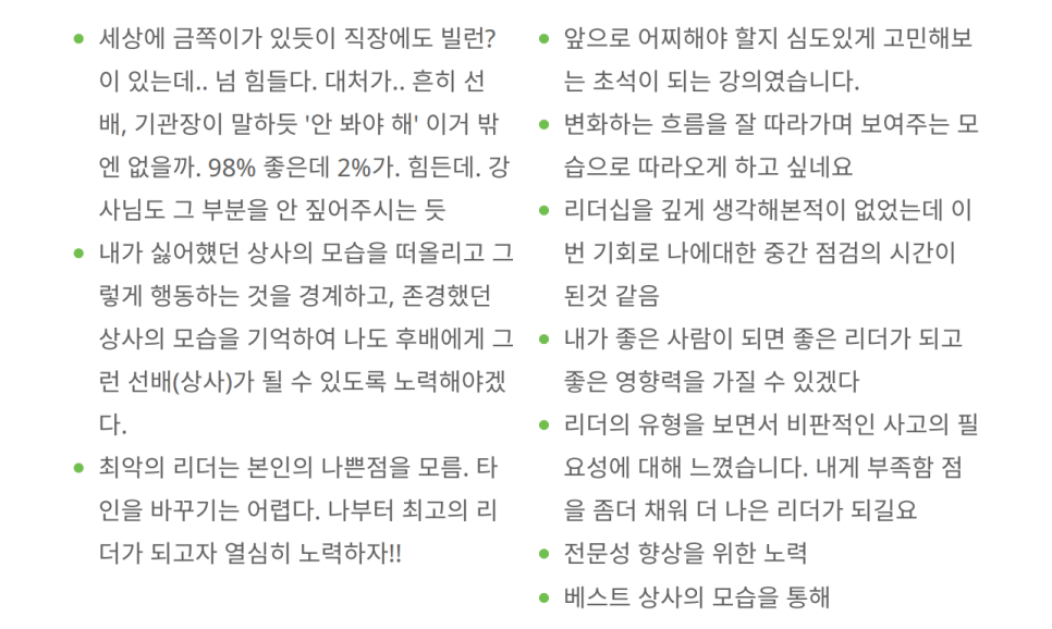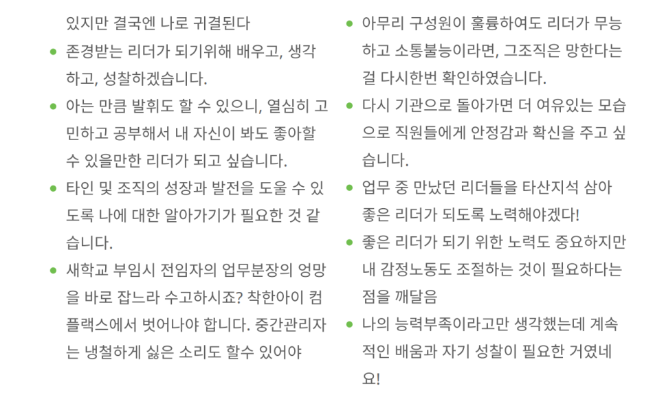 교육을 마무리하면서 함께 나눈 "좋은 리더가 된다는 것은 무엇인가?"라는 질문에 대한 답들이 아직도 마음에 남습니다.