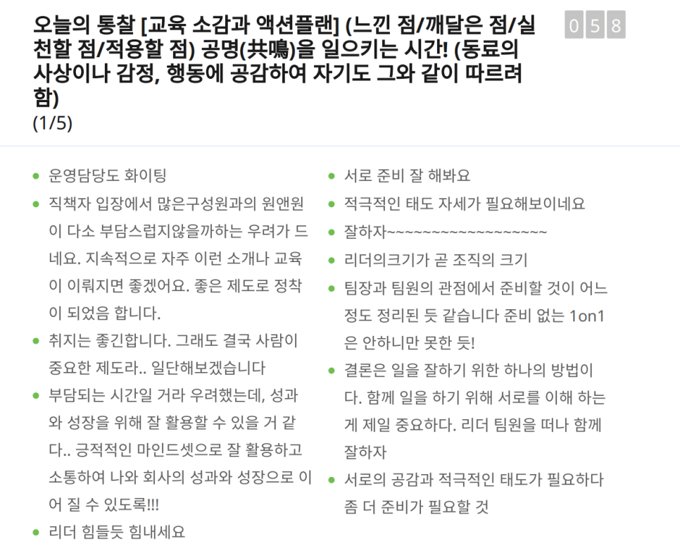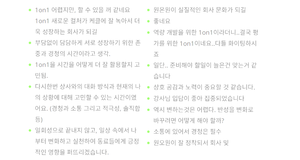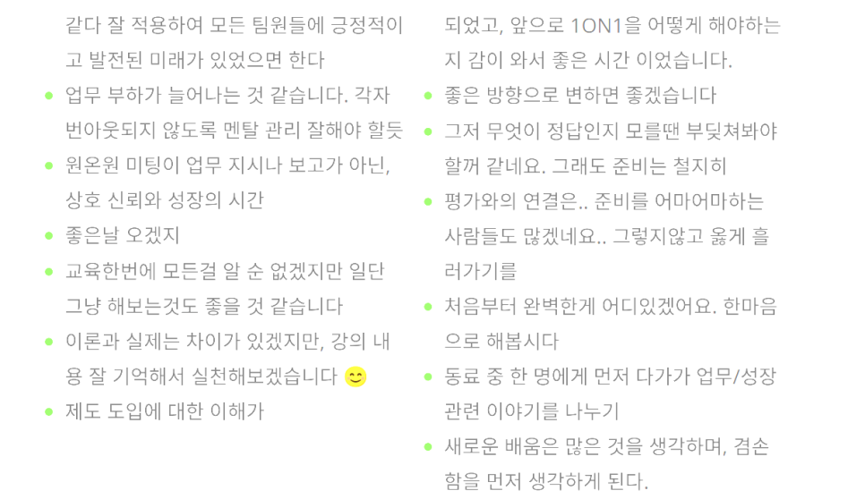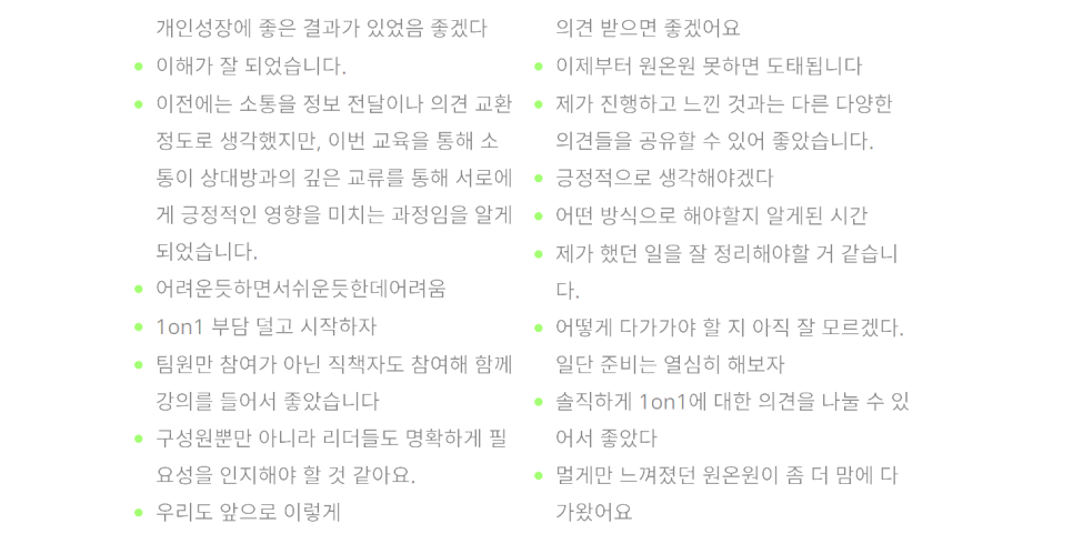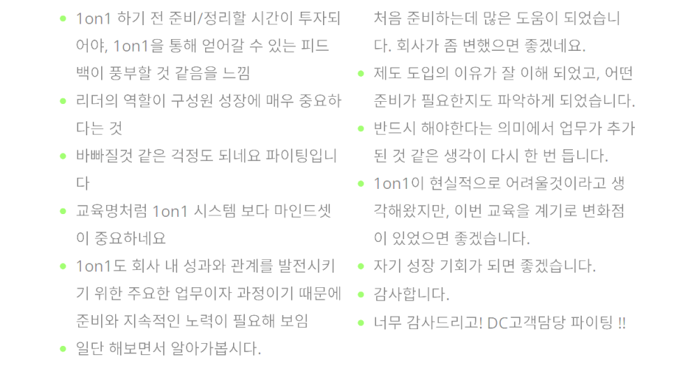교육 담당자분께서 주신 피드백 중에서 가장 기억에 남는 것은 "팀원들에게 원온원의 개념을 명확히 설명해주어서 좋았다"는 말씀이었습니다. 원온원이 팀장만의 책임이 아니라 팀원도 함께 준비하고 참여해야 하는 협력의 시간이라는 것을 정확히 전달할 수 있어서 다행이었습니다.