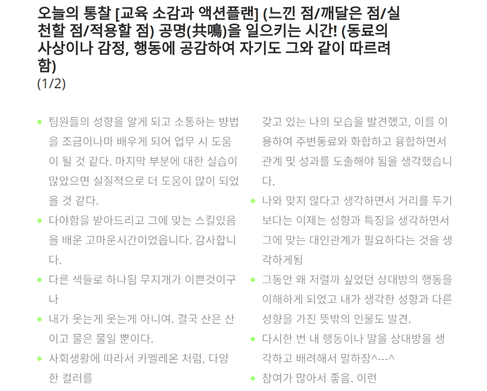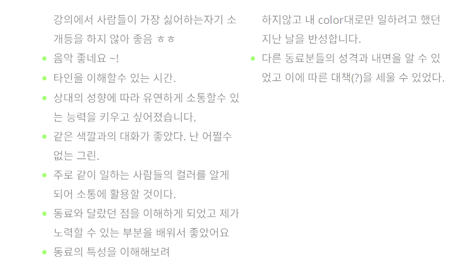 교육이 끝난 후, 교육 담당자님으로부터 들은 피드백은 제게 깊은 울림을 주었습니다. "구성원들이 조직에 잘 적용할 수 있는 관계와 커뮤니케이션에 대한 지식과 통찰을 얻었습니다", "4가지 컬러를 통해 타인의 성향을 이해하고, 그에 맞는 리더십과 소통 방법을 알게 되었습니다"라는 말씀은 이번 워크숍의 핵심 목표가 성공적으로 달성되었음을 확인시켜주었습니다.