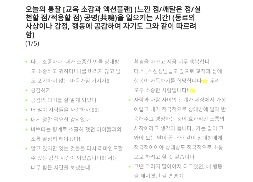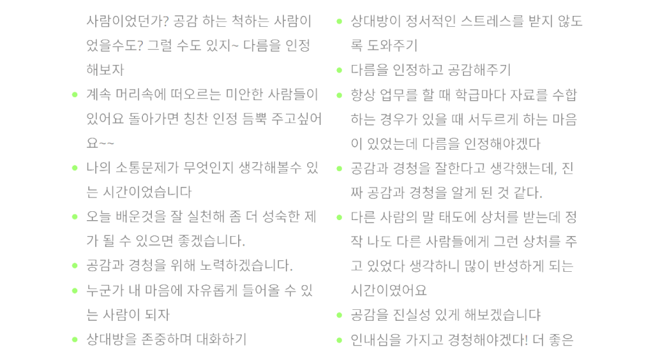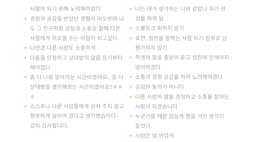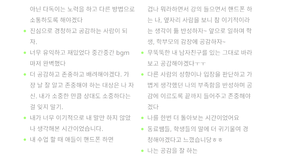 교육현장에 들어서는 순간부터 느껴진 교육생들의 열정적인 에너지는 저에게도 큰 감동을 주었습니다. 각기 다른 교육 현장에서 활동하시는 선생님들이지만, 더 나은 소통을 위해 배우고자 하는 마음만큼은 하나였습니다.