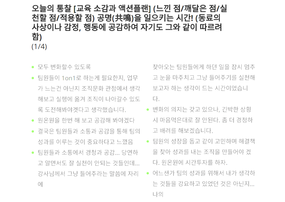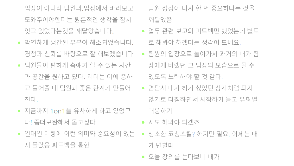 이번 교육을 통해 많은 리더분께서 원온원이 조직관리와 소통의 핵심이라는 것을 명확히 이해하고, 팀장으로서의 책임과 역할을 새롭게 다지는 계기가 되었기를 바랍니다. '엄청난 몰입도를 유지하면서 중요한 것만 쏙쏙 이야기해줘서 교육생들에게 너무나 도움이 된 시간'이라는 교육 담당자분의 말씀처럼, 임팩트 있는 내용만을 전달하여 실질적인 인사이트를 얻고 열심히 성과를 내는 리더로 거듭나는 시간을 선물해드리고 싶었습니다.