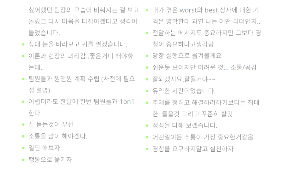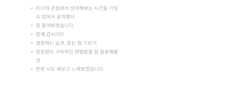 여러분의 리더십 여정에 의미 있는 시작점이 되었기를 소망합니다. 앞으로도 팀원들과의 진정한 '원온원'을 통해 성과를 넘어 성장을 이끄는 훌륭한 리더로 빛나시길 응원하겠습니다. 다시 한번 뜨거운 열정으로 함께 해주신 모든 분께 깊은 감사를 드립니다.