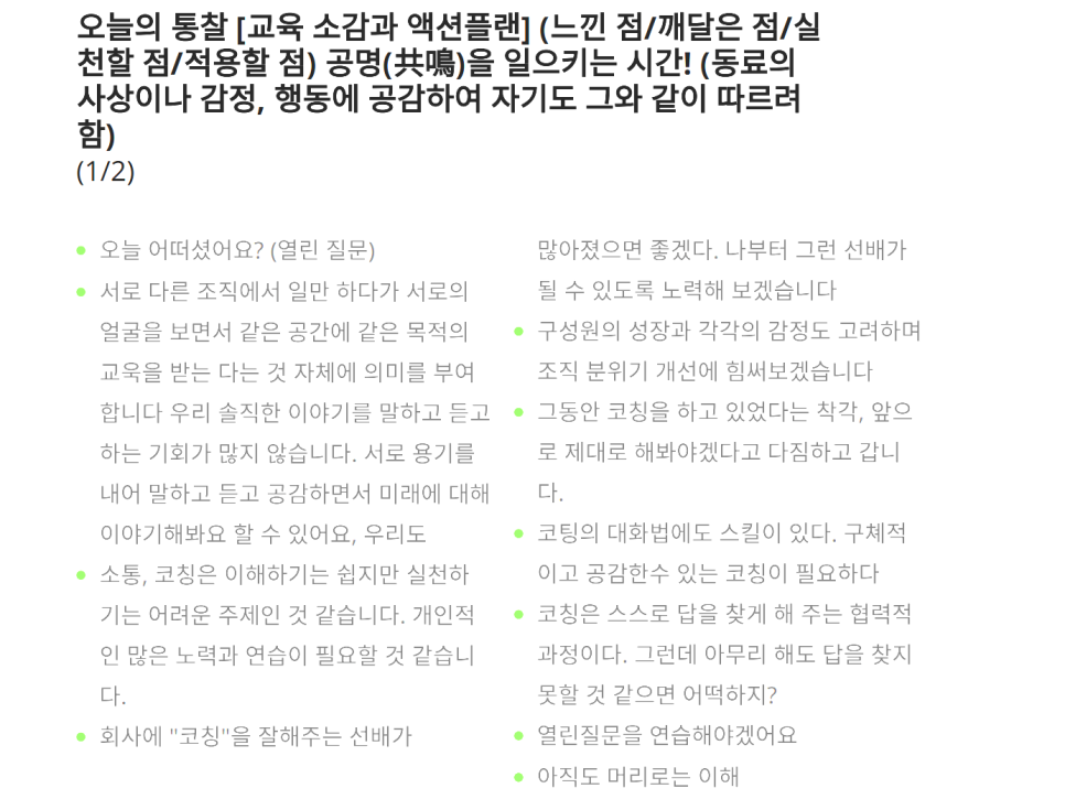 강의 후 교육 담당자님으로부터 들었던 피드백은 제게 깊은 울림을 주었습니다. "코칭리더십 과정을 통해 리더로서 구성원들과 어떻게 면담하는지에 대한 인사이트를 얻고, 열심히 성과를 내는 리더로 거듭나는 시간이었다", "중요한 것만 쏙쏙 이야기해줘서 너무나 도움이 된 시간"이라는 말씀은 제가 추구하는 강의 방향이 옳았음을 증명해 주었습니다. 코칭은 단순히 누군가를 가르치는 행위가 아니라, 구성원이 스스로 답을 찾고 성장할 수 있도록 돕는 리더의 역할임을 다시 한번 강조할 수 있었습니다.