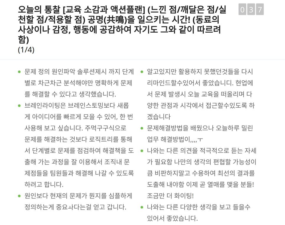 이 과정에서 쏟아지는 여러분의 아이디어와 논리적인 사고 과정은 저에게도 많은 영감을 주었습니다. 교육생들이 직접 손으로 쓰고, 붙이고, 토론하며 만들어낸 로직트리는 단순한 결과물이 아니라, 여러분의 깊은 고민과 협업의 산물이었습니다. 교육 담당자분께서 "로직트리를 통해 논리적으로 문제를 해결할 힘을 얻었다"고 하셨을 때, 저는 여러분이 앞으로 어떤 문제든 해결할 수 있는 튼튼한 논리의 뼈대를 갖추게 되셨음을 확신했습니다.