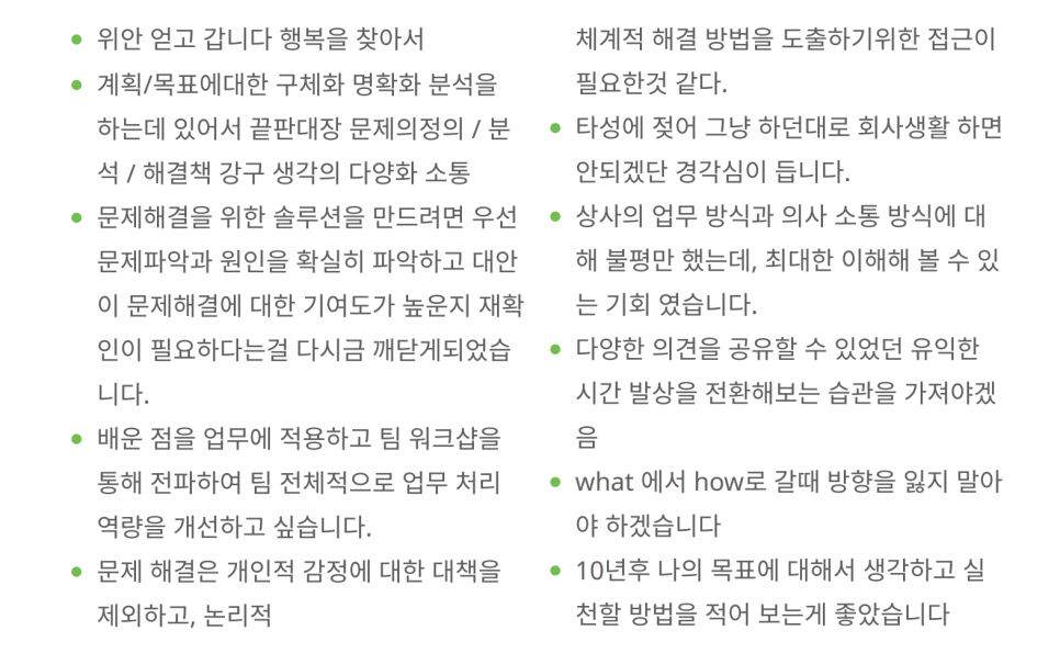 교육 담당자분께서 "조직에서 해결해야 할 문제에 대한 정의를 제대로 할 수 있는 힘을 얻었다"고 말씀해주셨을 때, 제가 가장 중요하게 생각하는 강의 목표가 달성되었음을 확인할 수 있었습니다. 이는 여러분의 적극적인 참여와 몰입이 만들어낸 값진 결과입니다.