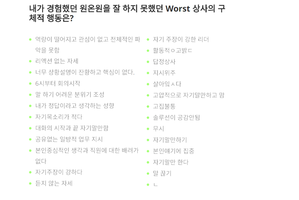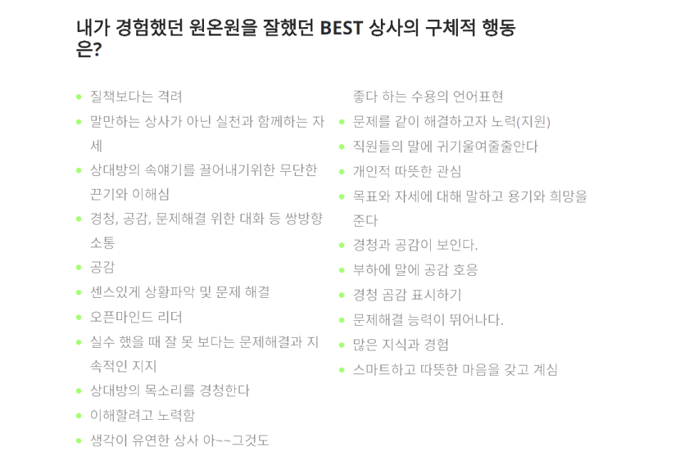 슬라이도 플랫폼으로 팀장님들의 생각을 실시간으로 모았을 때, "원온원 후 팀원이 어떤 생각을 하길 바라시나요?"라는 질문에 다양한 답변이 쏟아졌습니다. 이 순간이야말로 집단지성의 힘이었습니다. 서로의 생각을 확인하며 "아, 이런 관점도 있구나" 하고 고개를 끄덕이시는 모습에서, 이미 배움은 시작되고 있었습니다.