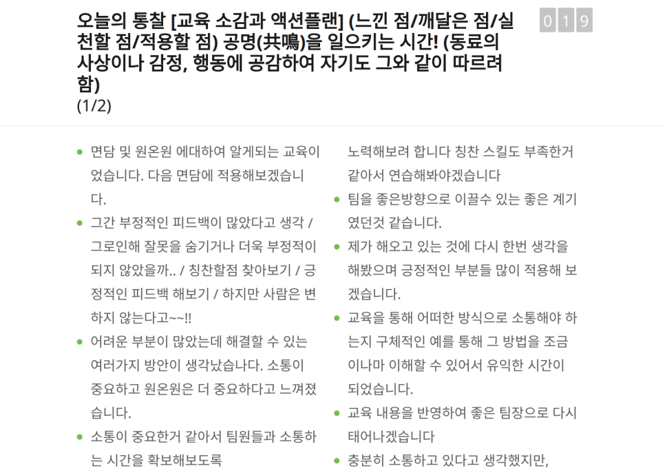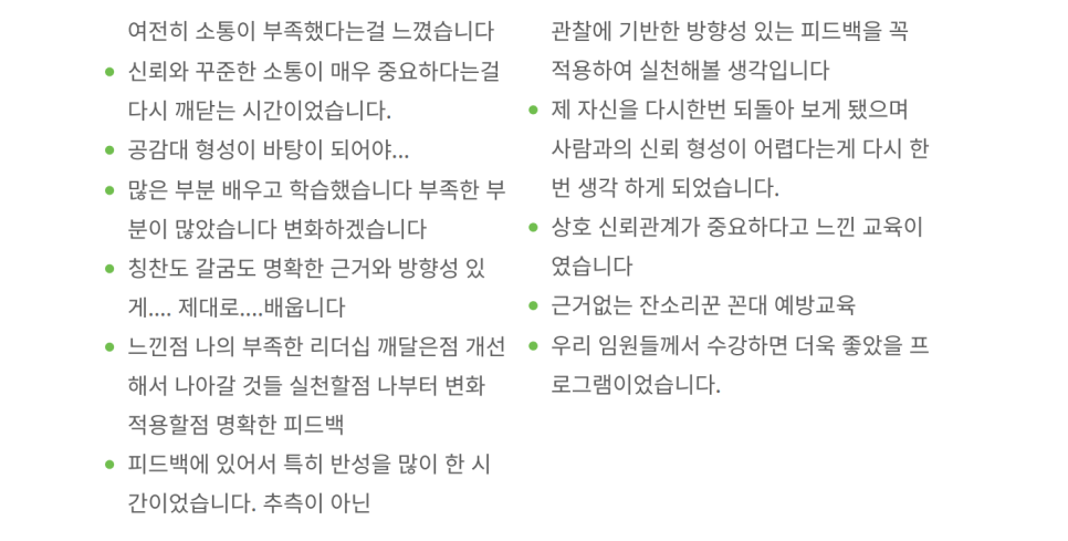 교육을 마치고 나서 받은 피드백들이 참으로 감사했습니다. "리더십 지식이 아니라 리더로서 생각하고 통찰하며 성찰하는 방법을 배웠다", "단순한 이론이 아니라 경험과 사례를 통해 배워서 더 와닿았다", "명강사라고 불리는 이유를 알겠다"는 말씀들이 제게는 큰 힘이 됩니다.