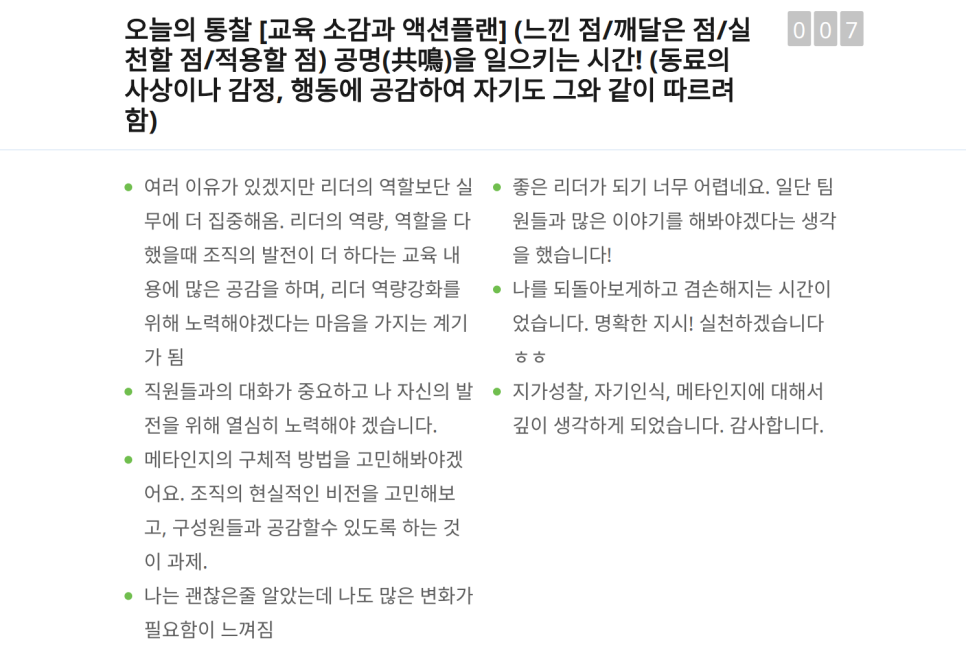 교육 담당자님께서는 "리더의 핵심역량 중 하나인 자기인식에 대해서 돌아보고 리더가 변하지 않는 이유에 대해서 통찰하게 했다"고 평가해 주셨습니다. 맞습니다. 리더십 변화의 첫걸음은 '나'를 제대로 아는 것에서 시작됩니다.