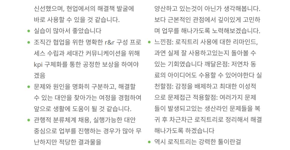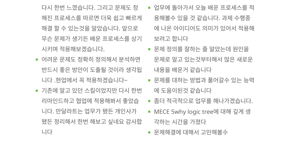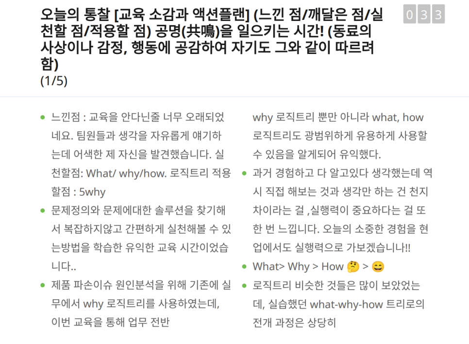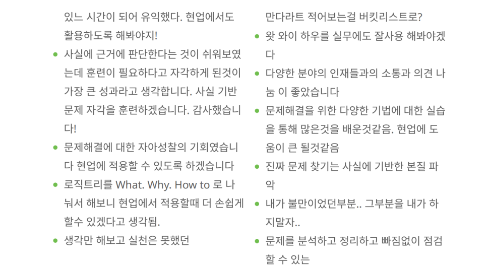 교육생분들의 강의 평가에서도 언급되었듯이, 이 실습은 단순한 지식 전달이 아닌 '스스로 얻는 인사이트'를 극대화했습니다. 로직트리를 통해 우리 조직의 문제를 함께 진단하고 해결책을 논리적으로 구축함으로써, 여러분은 문제해결을 위한 강력한 '논리적 무기'를 장착하셨습니다. 제가 퍼실리테이터로서 유연하고 부드럽게 진행할 수 있었던 것은, 무엇보다 교육생분들의 엄청난 몰입도와 참여 덕분입니다.