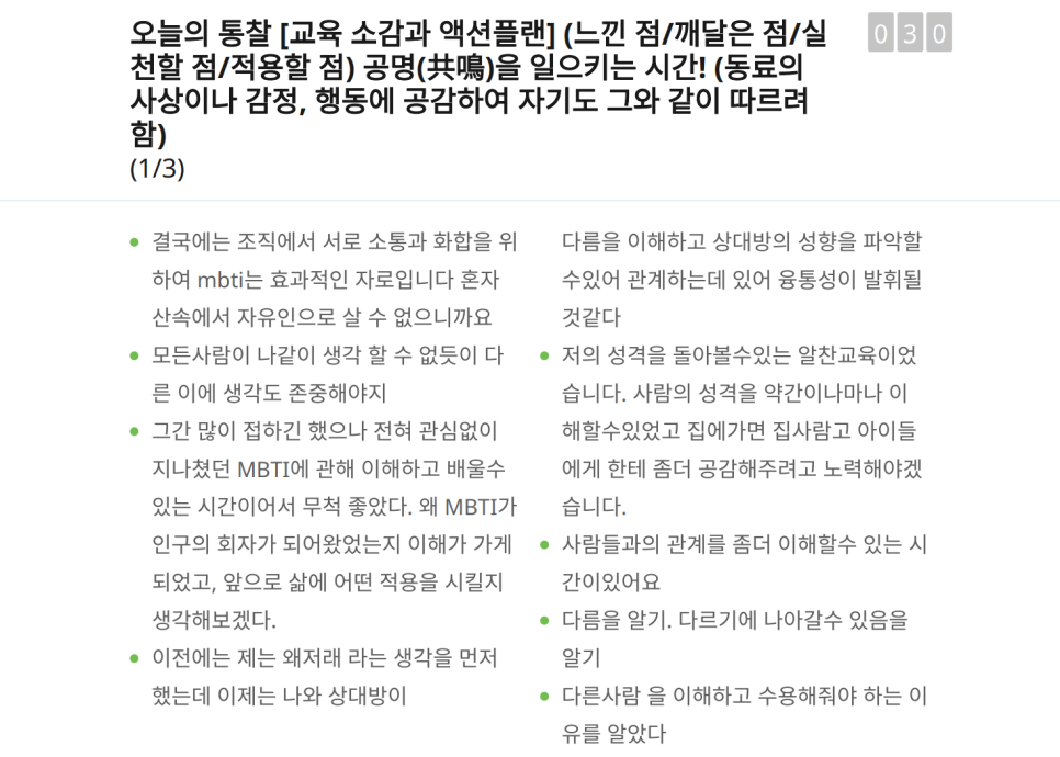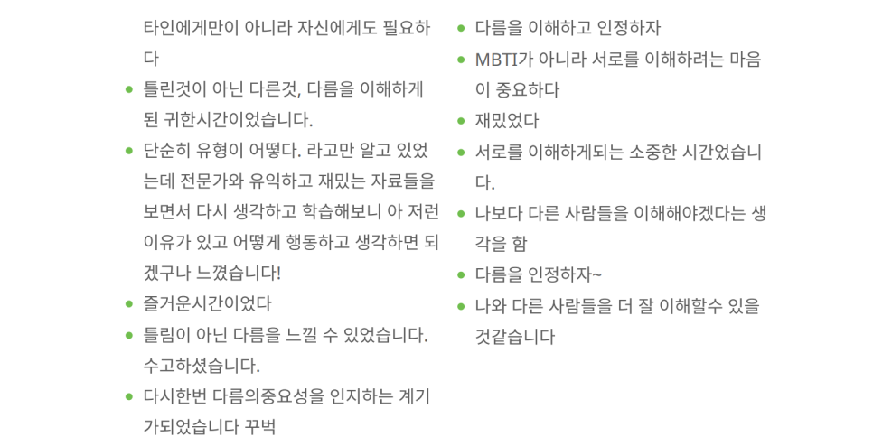 교육생 여러분께서 "특강이지만 중간 중간에 토의식으로 서로의 생각을 공유할 수 있도록 하는 실습을 함으로써 특강의 효과가 배가 되었다"고 평가해 주셨을 때, 저는 강사로서 큰 보람을 느꼈습니다. 단순히 듣고 끝나는 강의가 아니라, 스스로의 생각을 정리하고 타인의 관점을 이해하며 '같은 유형과는 다른 성격'을 인식하는 소중한 시간이었습니다. 실제로 "시간 가는 줄 모르고 특강에 몰입했다"는 피드백은 교육생들의 집중도가 얼마나 높았는지를 증명합니다.
