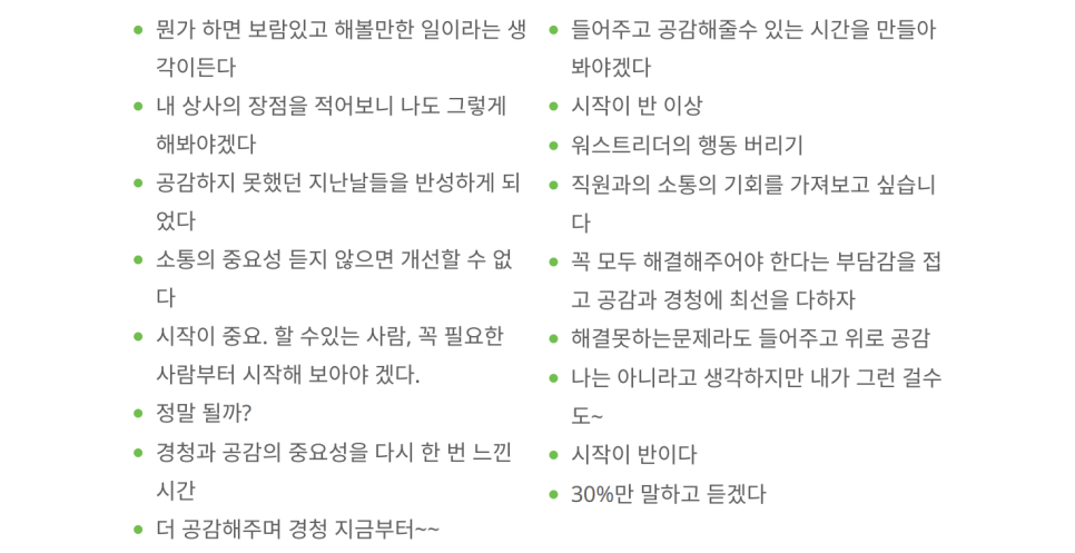 강남세브란스병원 간호 리더 분들과 함께한 2시간의 여정이 끝났습니다. 교육장을 나서는 팀장님들의 표정에서 무언가 달라진 것을 느낄 수 있었습니다. "이제 팀원들과 어떻게 대화해야 할지 알겠어요"라는 한 분의 말씀이 오늘 교육의 의미를 대변해 주었습니다.