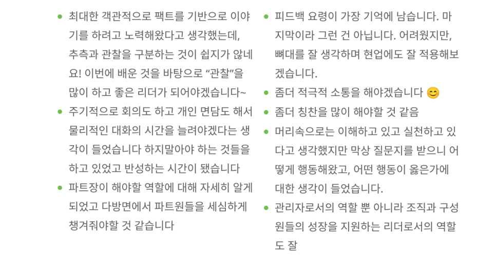 특히 피드백 시 관찰과 추측을 구분하는 연습은 교육생 분들에게 큰 인사이트를 제공했습니다. 우리는 종종 관찰한 것과 추측한 것을 혼동하여 피드백을 하곤 합니다. 이를 명확히 구분하고, Triple S 방법론을 활용한 효과적인 피드백 스킬을 익히는 시간을 가졌습니다.