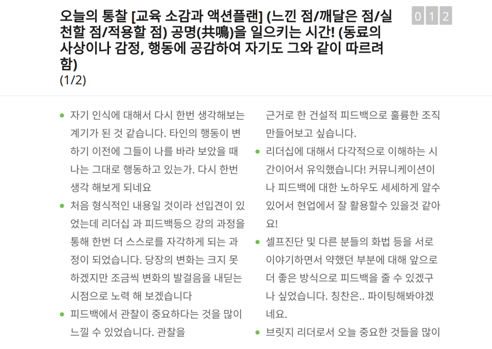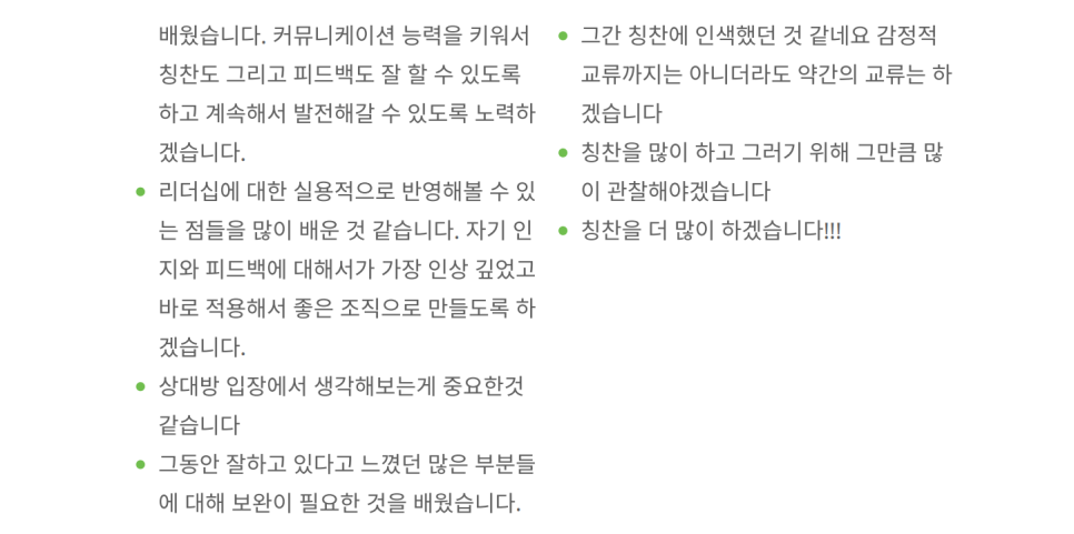 "성과와 목표를 달성하는 성과 피드백 프로세스"를 학습하며, 피드백이 '잘못을 지적하는 것'이 아닌, '구성원의 성장과 성과 향상을 위한 가장 강력한 도구'임을 명확히 이해하게 되었습니다.