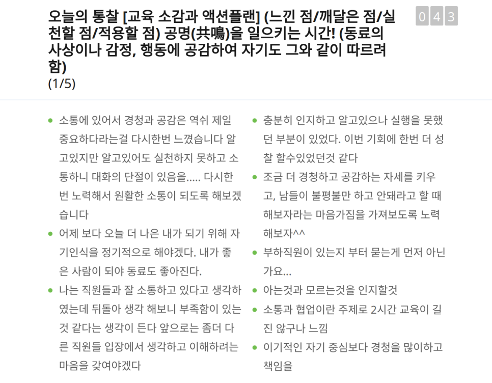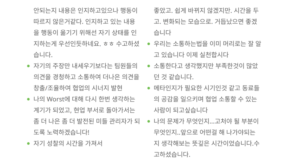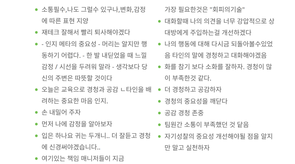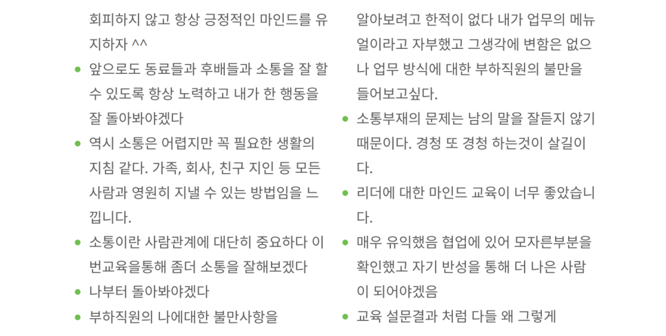 이번 교육은 유니투스 중간관리자 여러분이 "조직원들 사이에 어떻게 협업하고 소통하고 일을 해야 하는지에 대한 인사이트를 얻고 열심히 성과를 내는 구성원으로 거듭나는 시간"이 되었기를 바랍니다. 협업과 소통을 제대로 할 수 있는 '팁'을 얻으셨다면, 이제 현장에서 실천하여 조직 전체의 시너지를 극대화하는 일만 남았습니다.