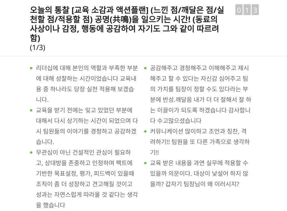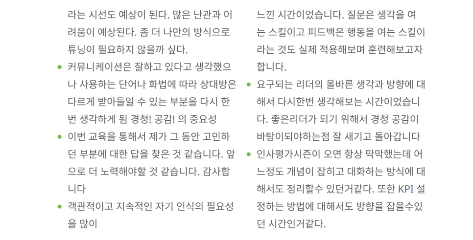 8시간이라는 긴 워크숍 시간에도 불구하고 팀장님들의 몰입도가 엄청났다는 교육생 평가에 진심으로 감사드립니다.