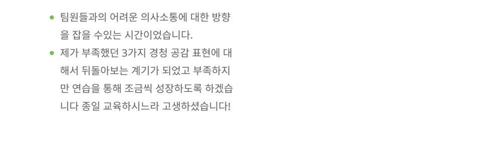 공감적 경청 5단계와 6가지 장애물을 실습하며, 진정한 의미의 경청이 무엇인지 깨닫는 시간을 가졌습니다.