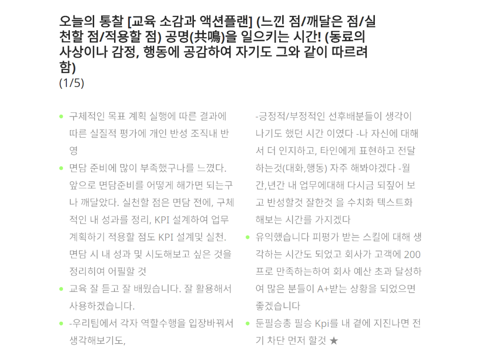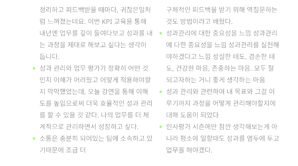 교육 담당자님께서도 언급해 주셨듯이, 성과와 실적의 개념 차이를 명확하게 설명해 드린 것이 성과관리의 본질적인 의미를 이해하는 데 결정적인 도움이 되었다는 피드백에 큰 보람을 느낍니다. 성과 창출의 핵심 요소는 일하는 과정에 대한 명확한 이해와 목표 수립에 달려 있으며, 리더뿐만 아니라 실무자 스스로가 성과를 관리해야만 조직 전체의 목표 달성이 가능하다는 점을 함께 공감했습니다.