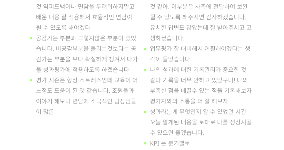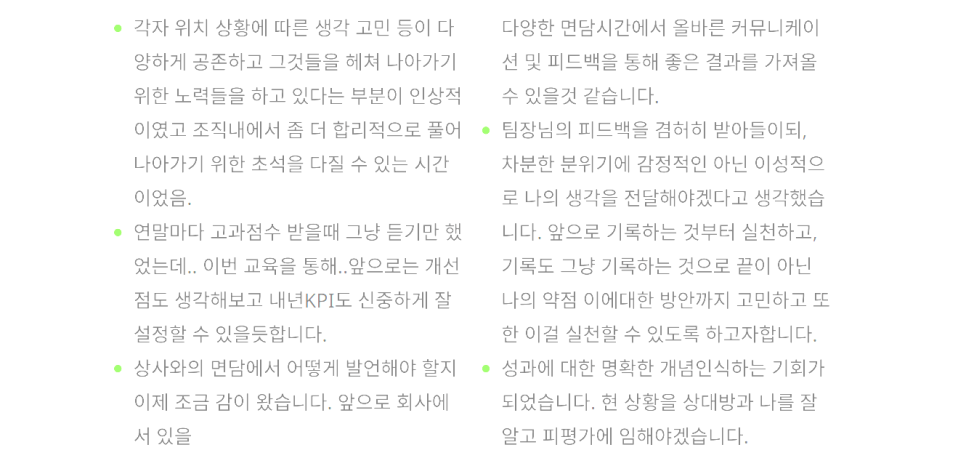 무엇보다 글로벌 빅테크 기업들이 성과를 내는 핵심 비결인 '원온원(One-on-One) 면담'에 대해 자세히 다루고, 그 구체적인 솔루션까지 명확히 제시해 드린 부분이 실무자 여러분께 큰 도움이 되었다는 피드백을 받았습니다. 성과 면담의 중요성과 구체적인 진행 방법을 풍부한 사례 위주로 풀어냈기 때문에, 실무에 돌아가 바로 적용할 수 있는 자신감을 얻으셨으리라 확신합니다.