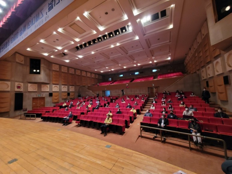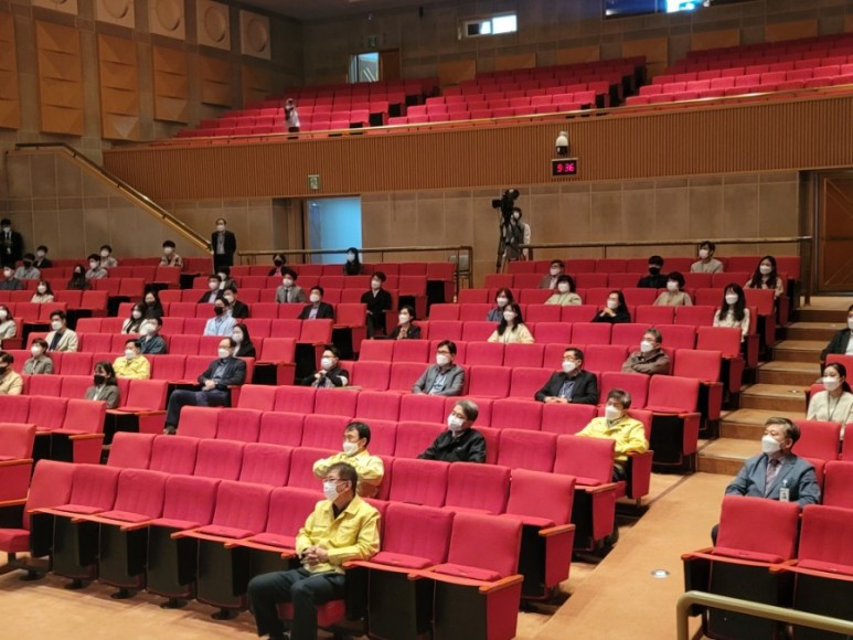 팬데믹 상황으로 인해 소수의 인원만 강당에 참여하고 다른 직원들은