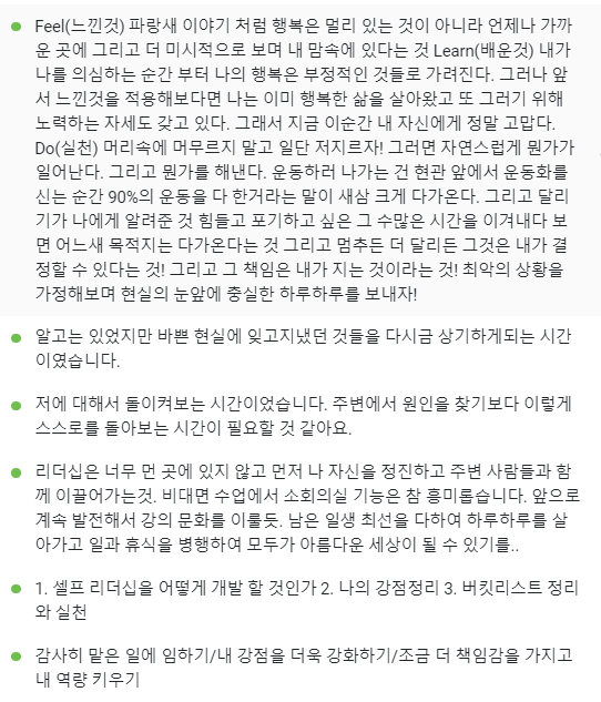 부단히 작성하고 생각한 것을 말하면서 서로 공유한 시간