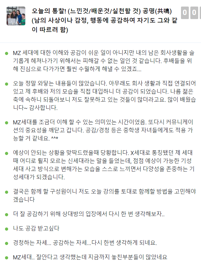 교육생들에게 질문을 던지고 그 질문에 대해서 서로의 생각을 공유함으로써
