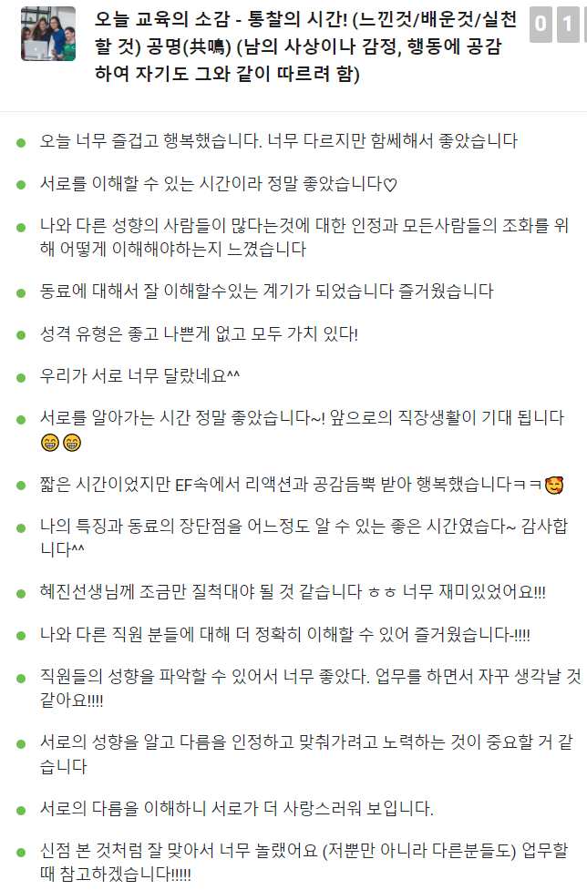 MBTI 진단을 기반으로 팀워크와 소통 능력을 향상시키는 과정.