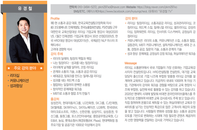 아래 2020년 업데이트 영상은 HR전문지 인재경영에 실린 명강사 인터뷰 때 작성된 초안을 기반으로 진행된 소개 영상입니다. 소통과 공감 소개, 유경철 대표의 철학, 강사라는 업에 대한 생각 등이 담겨져 있습니다