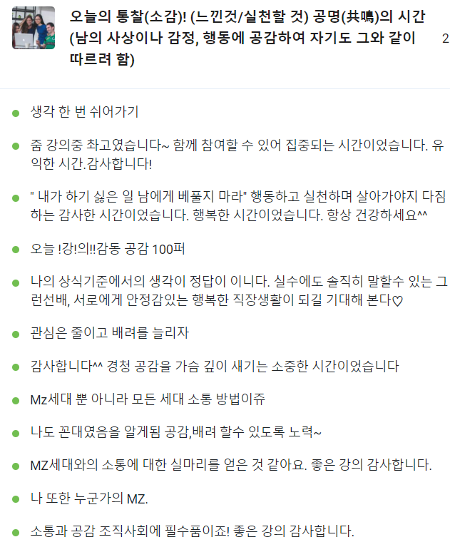 함께 공감하면서 대화를 나누고 집단지성을 통해 서로의 통찰을 살펴보는 시간.