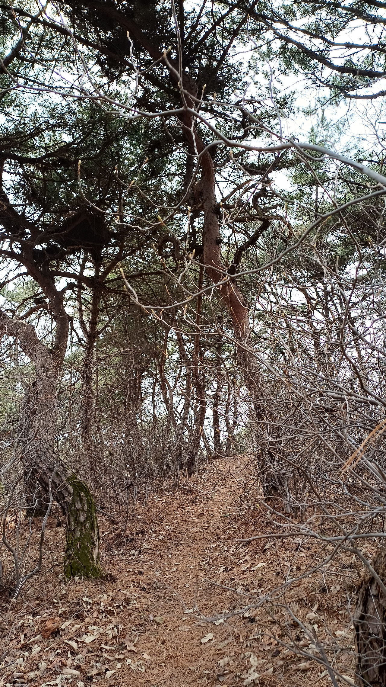 평일이라 산에 오르는 사람은 우리 두 사람밖에 없다. 느긋하게 천천히 걷는다. 소나무와 참나무, 소사나무 같은 정다운 나무들이 반갑다. 소나무들은 위로 우뚝 서기보다는 가지를 옆으로 뻗거나 줄기를 여러 개 만들어 자라고 있다. 세찬 바람과 소금기로부터 살아남기 위한 나름의 지혜라는 생각이 든다. 소나무 부근에는 여린 노간주나무가 많이 보인다. 햇빛이 가려 잘 자랄 수 있을까 염려스럽다. 그건 내 염려일 뿐, 나무는 스스로의 힘으로 잘 적응하고 살아갈 것이다.