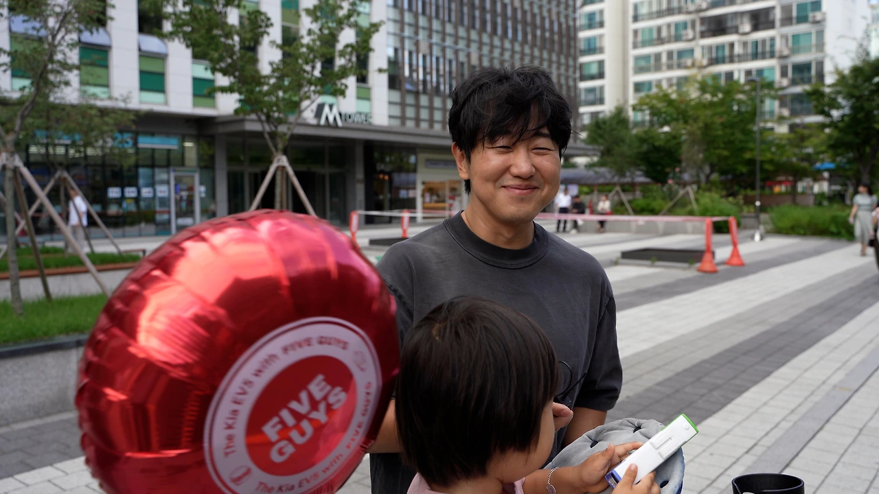 빨간 풍선을 손에 든 아이를 자전거 뒷좌석에 태우고 지나가는 모습에 이끌려 인터뷰를 요청했다.