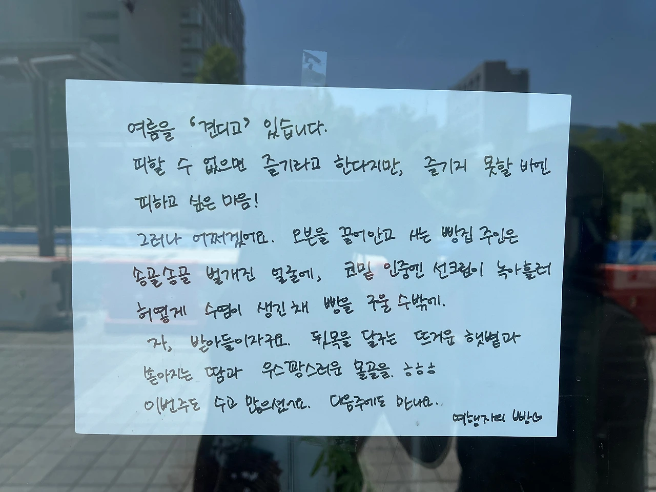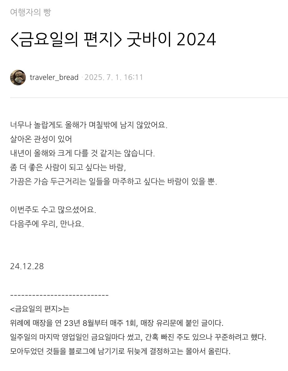 에디터는 주말마다 꼭 지나야 하는 길이 있다. 노란색 간판에 써진 '여행자의 빵', 문은 굳게 닫혀있지만, 이 곳을 지나갈 이유는 충분하다. 유리문에 붙여진 <금요일의 편지>.