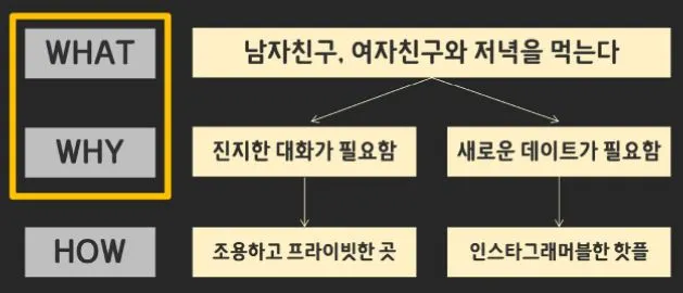 What이 남자친구나 여자친구와 저녁을 먹는 것이라면, Why는 내가 지금 처한 상황에 따라 달라질 수 있습니다. 만약 지금 둘의 사이가 좋지 않아, 저녁을 먹으면서 진지한 대화를 나누고 화를 풀어야 하는 상황이라면 How는 조용하고 프라이빗한 곳에서 식사하는 것이 될 수 있는 거죠.