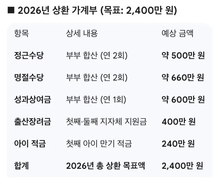 • 실행: 정근수당이나 명절수당 같은 보너스는 물론, 아이들을 위해 받은 출산장려금까지 한 푼도 허투루 쓰지 않고 상환에 투입했다.