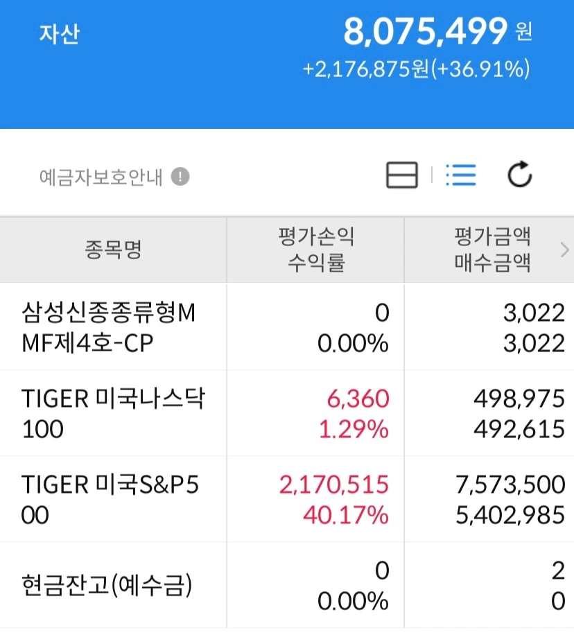 • 방법: 미국 시장의 우상향을 믿고, S&P500과 나스닥100 ETF를 1:1 비율로 적립식 매수