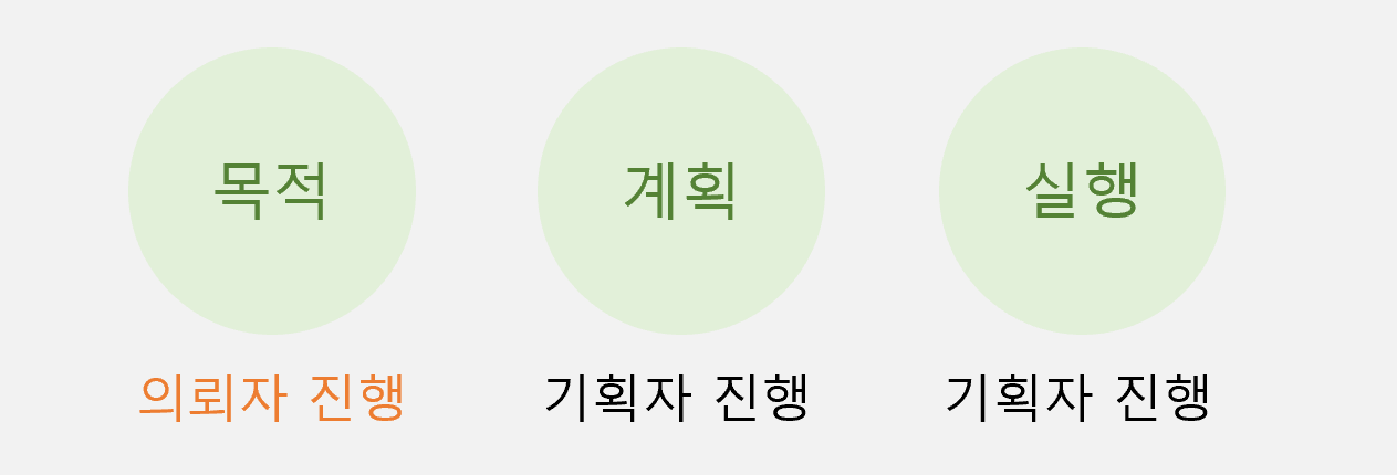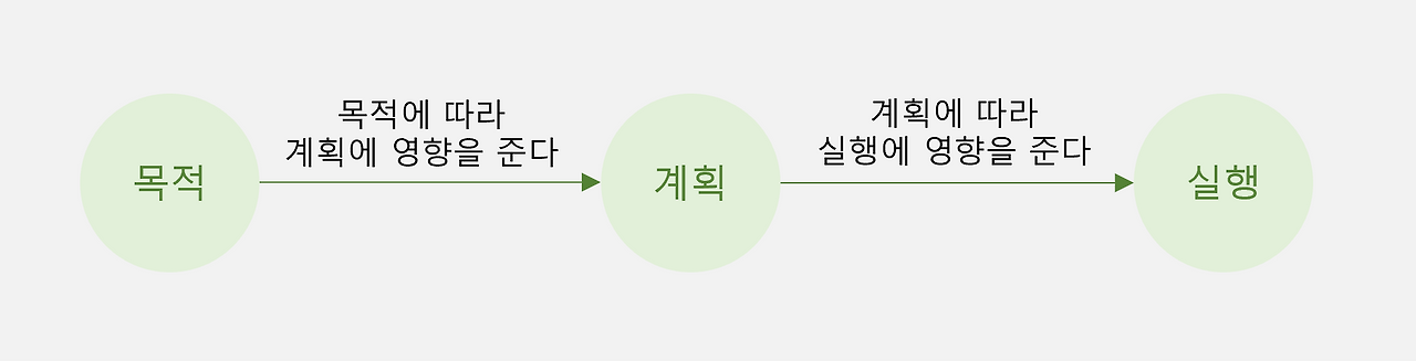 평생 기억에 남는 기쁨과 감동을 드리는 생일 파티라는 목적이 생겼고, 항상 하던 생일 파티로는 감동적인 생일 파티가 될 수 없다는 문제의식이 생겼습니다. 우리는 이 목적을 성공적으로 실행하기 위해 고민하게 됩니다. 먼저 어떻게 기억에 남게 할 것인가?를 고민하고, 고민 끝에 내린 결론을 실행하기 위해 계획을 세웁니다. 어느 시간에 만나면 가장 좋을지, 이 장소가 정말 최선의 장소인지 등 신중하게 생각하게 되고, 감동의 눈물을 쏟아낼 특별한 영상 편지를 준비한다든지, 부모님만을 위한 작은 공연을 준비하는 등 계획이 더욱 복잡해지고, 치밀해집니다. 이렇듯 특정한 목적이 설정되면, 계획이 바뀌게 됩니다. 단순한 생일 파티였다면, 시간, 장소, 케이크, 선물만 준비하면 되는 생일 파티였지만 평생 기억에 남는 생일이라는 목적이 설정되면서 계획이 변경되고, 계획에 따라 실행해야 하는 준비사항도 달라지는 것입니다.