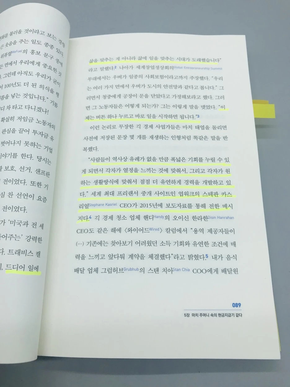 "우버가 설립된 2009년에도 이미 대부분의 택시 기사, 그리고 약 13퍼센트의 미국인이 자영업자나 독립 계약자로 일하고 있었다. 그밖에도 간접 고용 노동자가 점점 늘어나는 추세였다. (중략) 2016년 미국과 유럽연합의 경제활동인구 working-age population 중 20-30퍼센트가 프리랜서였다. 여기에 파트타임 노동자를 합치면 미국 노동자 중에서 풀타임 직장이 없는 사람이 무려 40퍼센트에 달한다는 추정치도 있다. 우버는 되도록 직원을 고용하지 않으려 하는 경영계의 풍토를 스마트폰 시대에 접목했을 뿐이다."