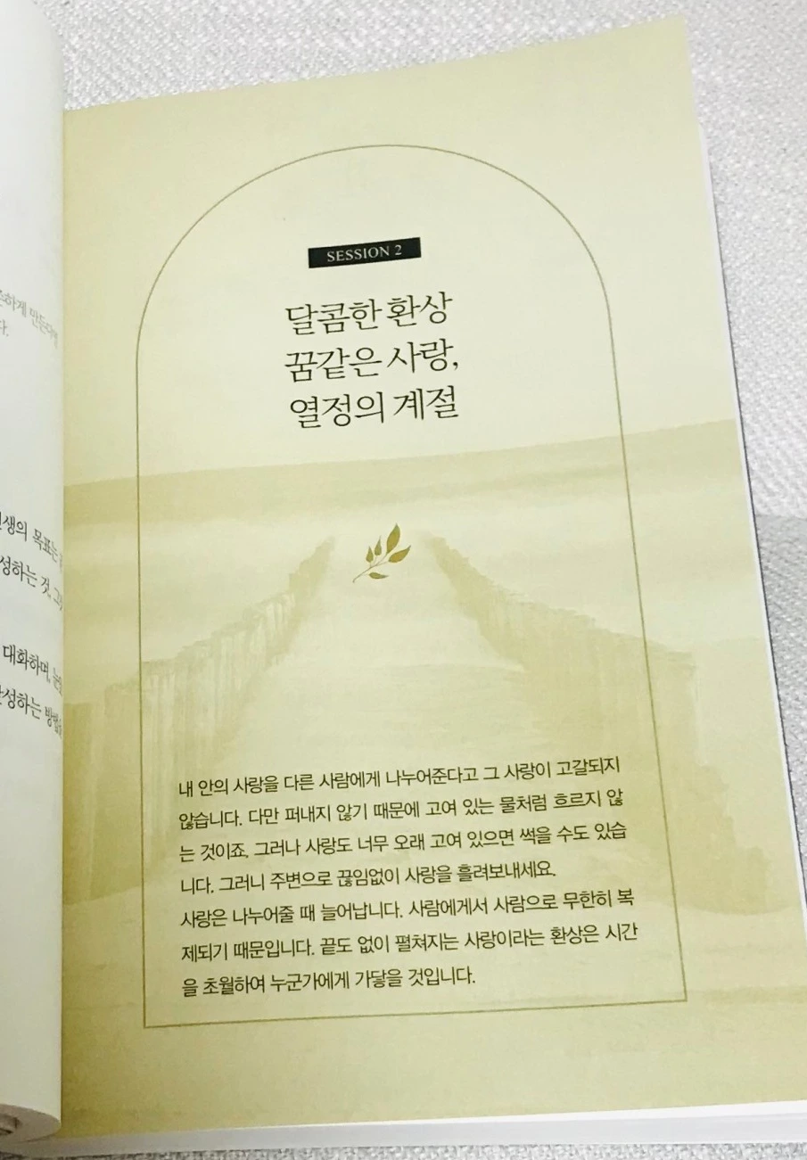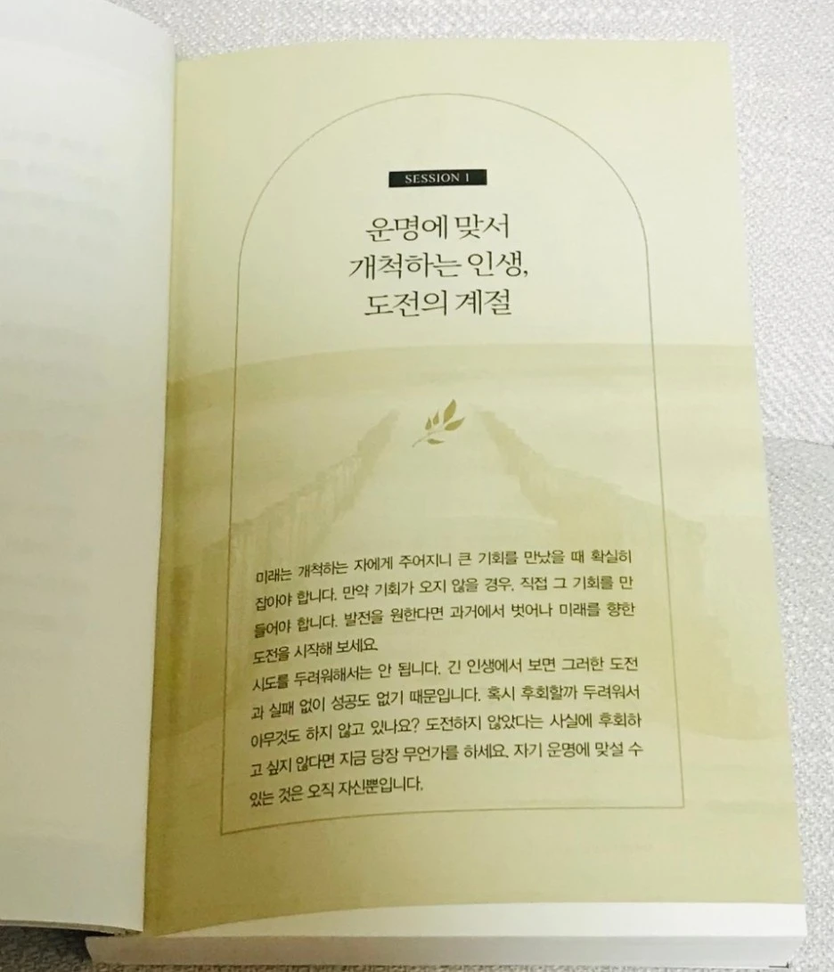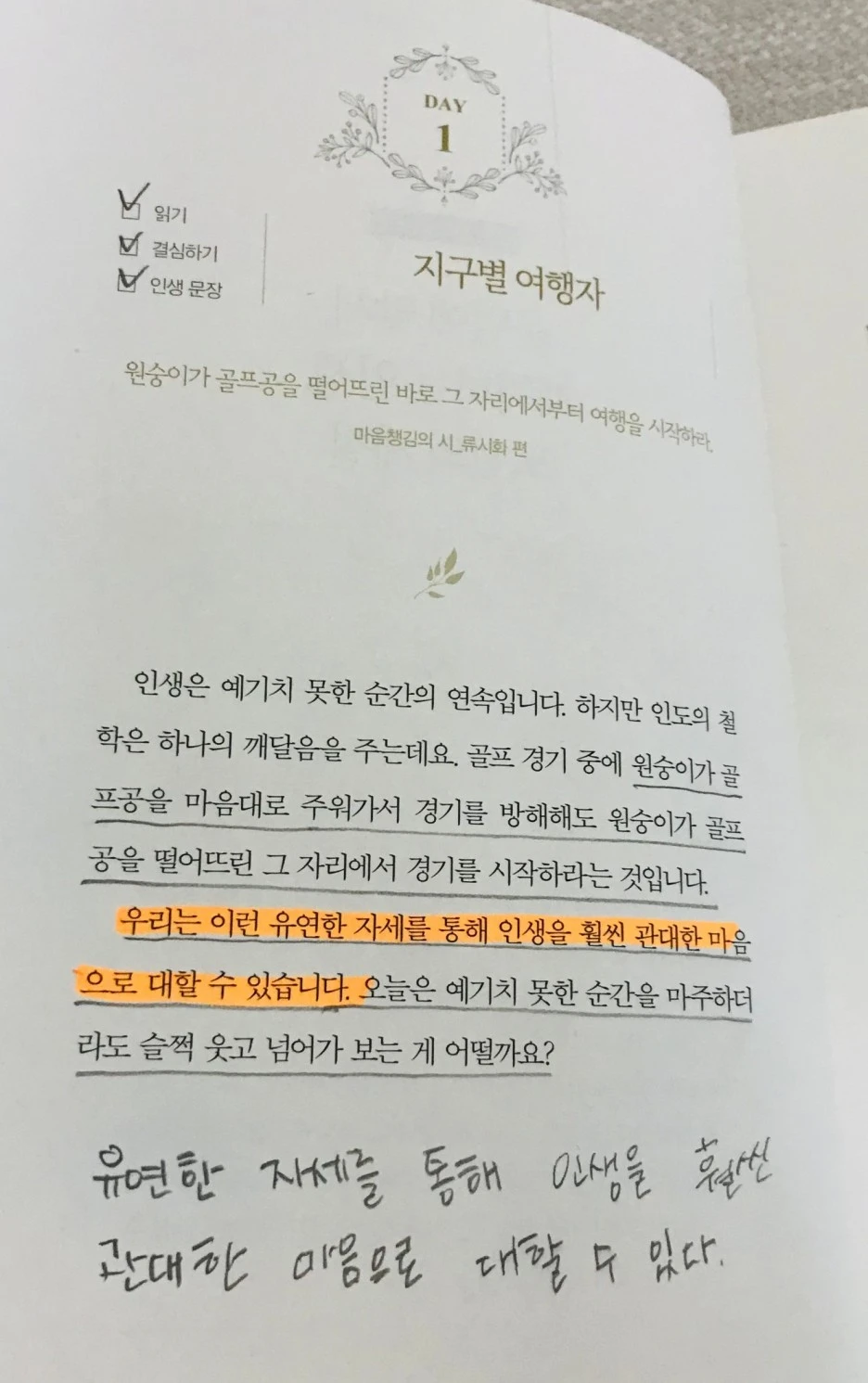 순서대로 책을 읽어나가는 것도 좋지만 매일매일 기대를 품고 책을 펼쳐서 나오는 부분을 읽는 것도 추천드립니다. 뭔가 오늘의 운세를 찾아보는 기대와 설렘을 품고서 책을 펼쳤을 때 나타난 문장은 더욱 의미가 있지 않을까요?! ^^