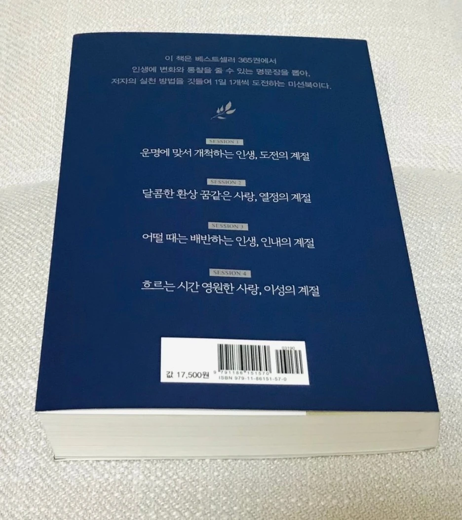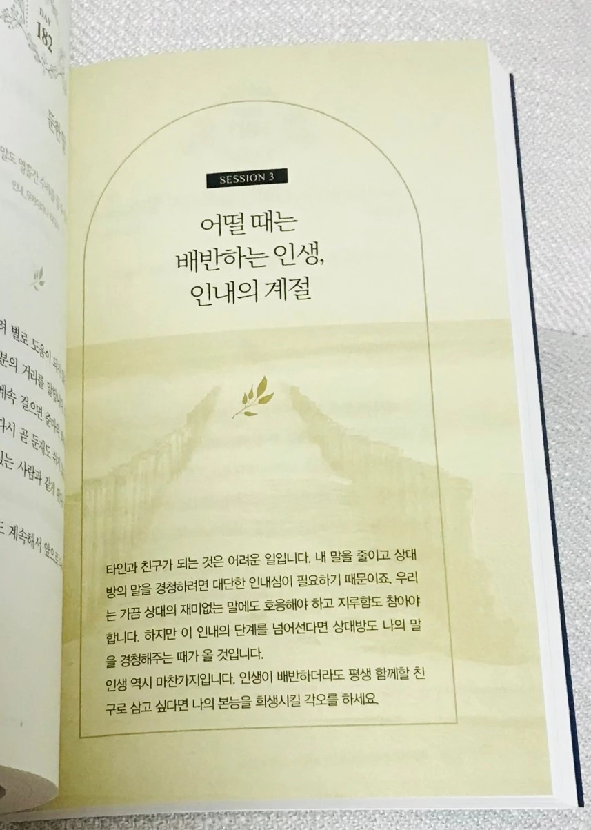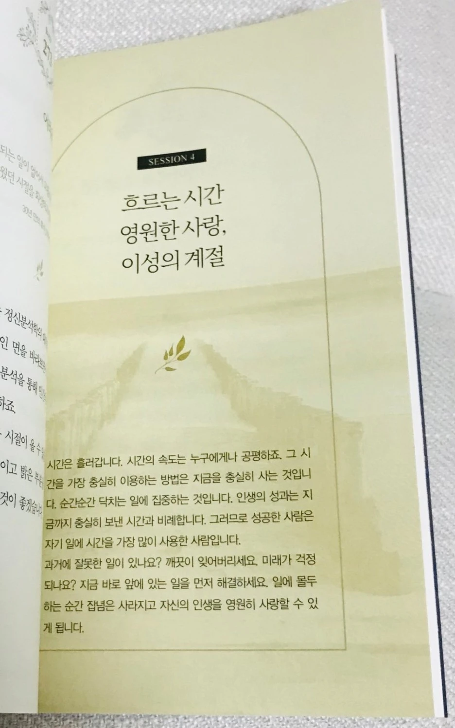 순서대로 책을 읽어나가는 것도 좋지만 매일매일 기대를 품고 책을 펼쳐서 나오는 부분을 읽는 것도 추천드립니다. 뭔가 오늘의 운세를 찾아보는 기대와 설렘을 품고서 책을 펼쳤을 때 나타난 문장은 더욱 의미가 있지 않을까요?! ^^