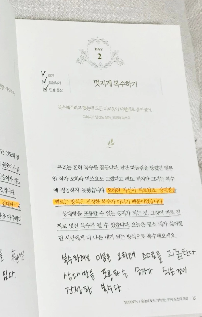 이 책에는 한 꼭지당 세 개의 체크박스가 있습니다. 바로 "읽기", "결심하기", 그리고 "인생 문장" 체크박스입니다.