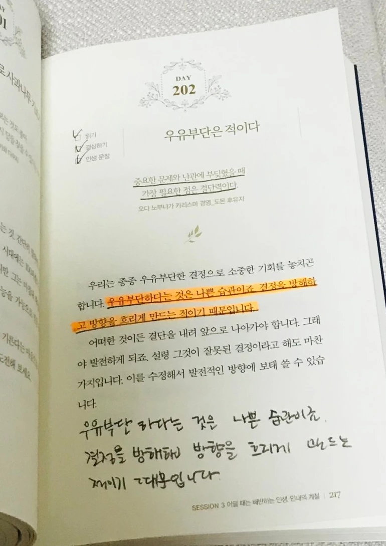 Day 202 [우유부단은 적이다] 전 오랫동안 우유부단한 성격을 가지고 있었습니다. 쉽게 남의 부탁을 거절하지 못해서 곤란한 상황에 놓였던 경우도 종종 있었습니다. 사랑했던 사람과의 사랑이 끝나고 헤어질 결심을 하고도 여러 번 번복하기도 했었습니다. 우유부단한 성격 탓에 잘못된 선택을 하기도 했는데 그 선택으로 인생의 큰 흐름이 바뀌기도 했었습니다. 그래서 전 우유부단한 성격이야말로 정말 나쁜 습관이라고 생각하게 되었습니다. 지금은 우유부단하지 않습니다. 예전에는 너무 분명하게 말하는 것이 실례가 되거나 상대에게 상처를 줄 수 있지 않을까 고민했지만 제가 겪어본 결과 오히려 아닌 건 처음부터 아니라고 하는 게 서로를 위해 최선이라는 것을 깨닫게 되었습니다. 인간관계에서뿐만 아니라 일을 하는 데 있어서도 행동이 중요하다는 것을 깨닫게 되면서 실패하더라도 실수하더라도 일단 행동하는 좋은 습관이 생겼습니다. "중요한 문제와 난관에 부딪혔을 때 가장 필요한 점은 결단력이다. <오다 노부나가 카리스마 경영 도몬 후유지>"