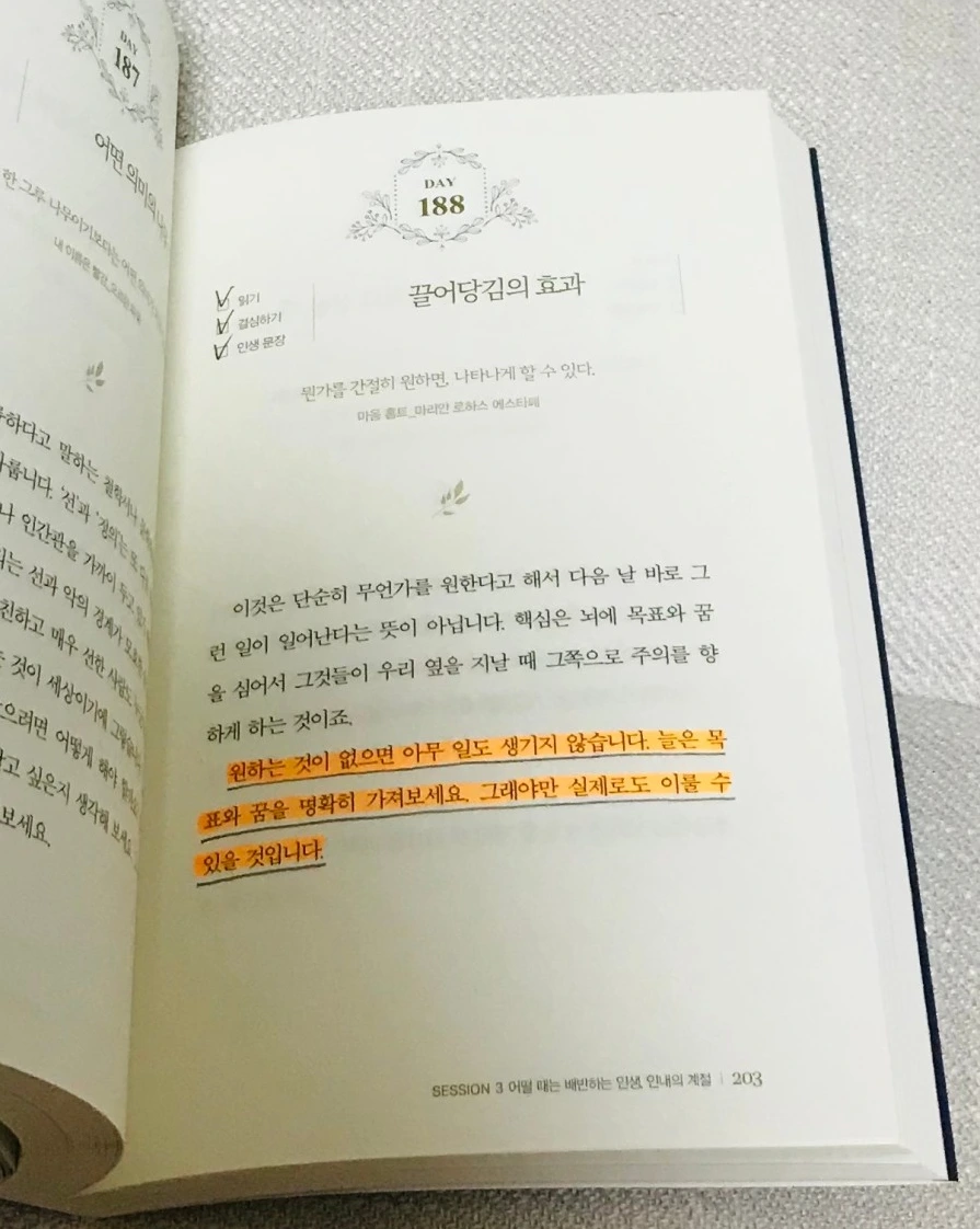 그래서 전 이 책 Day188일 [끌어당김의 효과]에서 "원하는 것이 없으면 아무 일도 생기지 않습니다. 높은 목표와 꿈을 명확히 가져보세요. 그래야만 실제로도 이룰 수 있을 것입니다.<마음 홈트, 마리안 로하스 에스타페>"라는 인생 문장이 와닿았습니다. 이는 끌어당김의 법칙과 관련된 것인데 끌어당김의 법칙이란 원하는 것을 간절히 바라고 또 바라면 (단, 바라기만 하고 행동하지 않으면 이루어지지 않음. 반드시 행동해야 함.) 결국 온 우주가 우리의 목표를 이룰 수 있도록 도와준다는 것입니다.