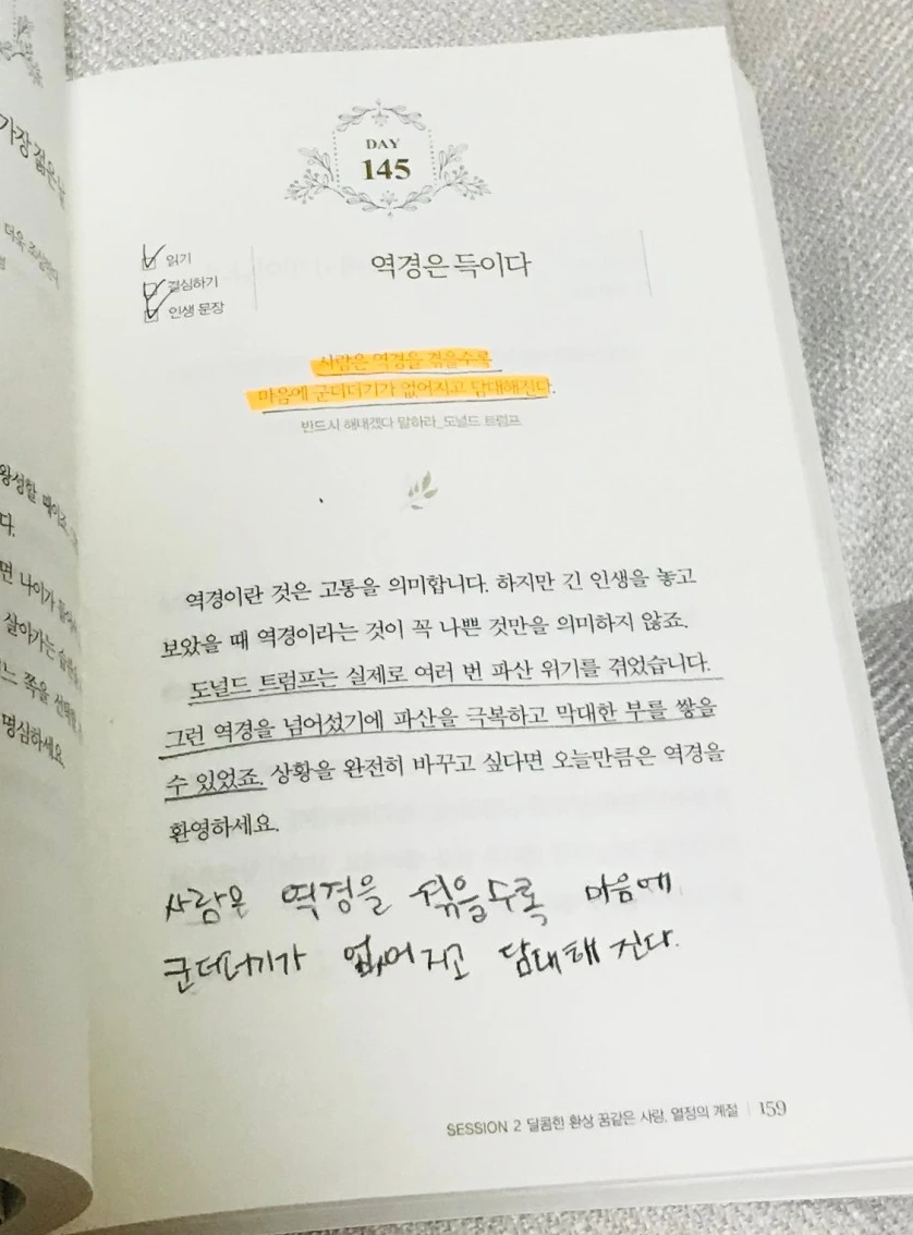 Day 145 [역경은 득]이다. 역경은 독이다가 아니라 역경은 득이다입니다. 도널트 트럼프의 <반드시 해내겠다 말하라>에 나오는 인생 문장입니다. "사람은 역경을 겪을수록, 마음에 군더더기가 없어지고 담대해진다." 30대 힘들었던 순간들을 다 겪고 나니 저를 힘들게 하고 좌절하게 했던 역경들이 독이 아니라 득이었다는 걸 알게 되는 깨달음이 있었습니다. 만약 제가 그러한 역경을 겪지 않았다면 여전히 온실 속의 화초처럼 살아가는 삶만이 올바른 삶이라고 착각하고 살고 있었을 지도 모릅니다. "전투력"이 상승되어 이제는 웬만한 일에는 크게 힘들어하거나 좌절하거나 하지 않습니다. 반응을 거의 하지 않으려고 노력하는 거죠. 여기서 전투력은 다른 사람들과 싸우겠다는 전투력이 아니라 내가 원하는 나의 삶의 목표를 설정해서 그 목표를 이루기 위해 최선을 다해 살아가고자 하는 긍정 에너지 전투력을 의미합니다.