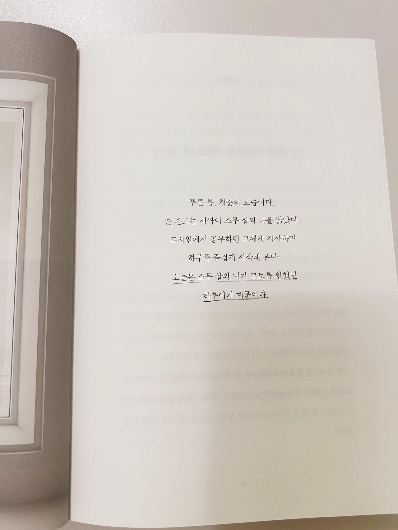 "푸른 봄, 청춘의 모습이다. 손 흔드는 새싹이 스무 살의 나를 닮았다. 고시원에서 공부하던 그에게 감사하며 하루를 즐겁게 시작해 본다. 오늘은 스무 살의 내가 그토록 원했던 하루이기 때문이다."