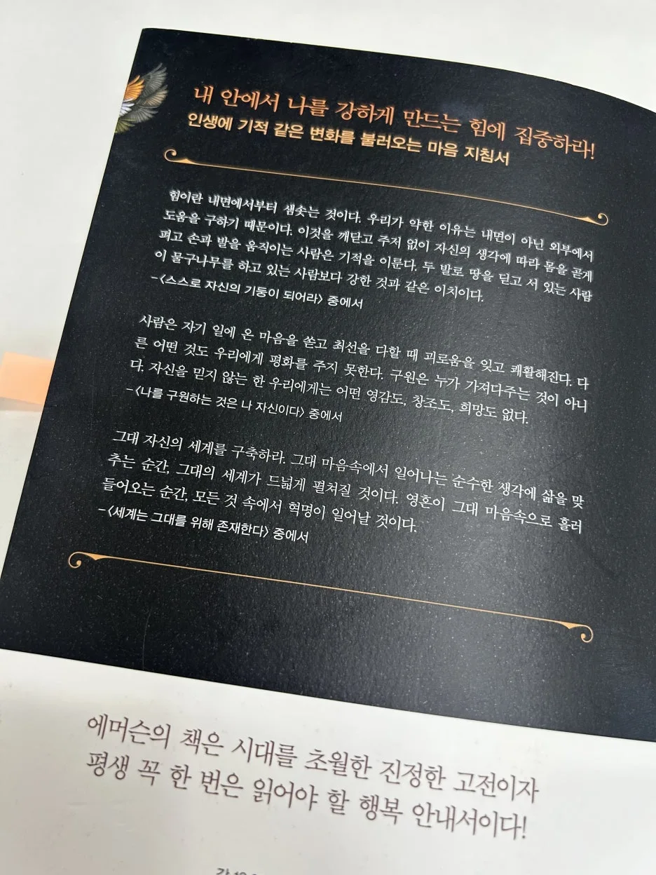이 책은 나폴레온 힐의 "나폴레온 힐 성공의 법칙 The law of success"를 읽던 중 p.390-391에 에머슨에 대해서 언급한 내용이 나온다. 그래서 구입하게 된 책이다.